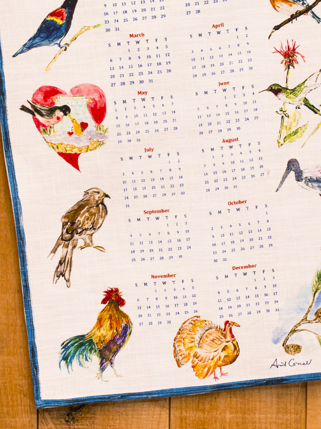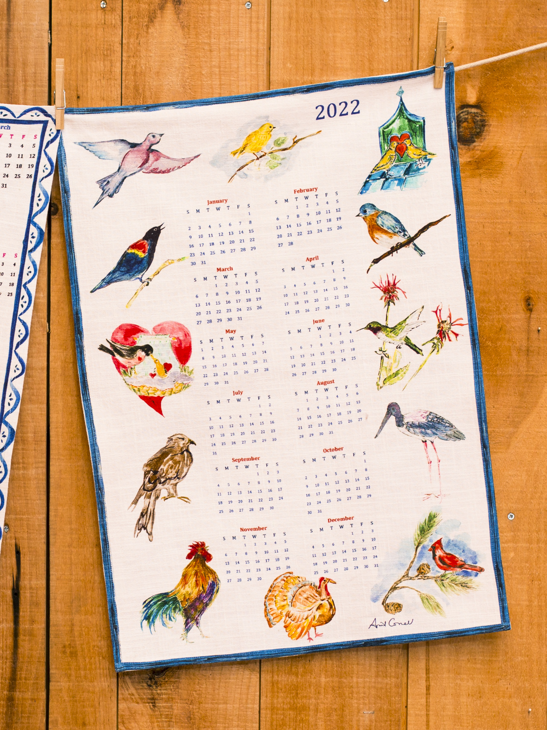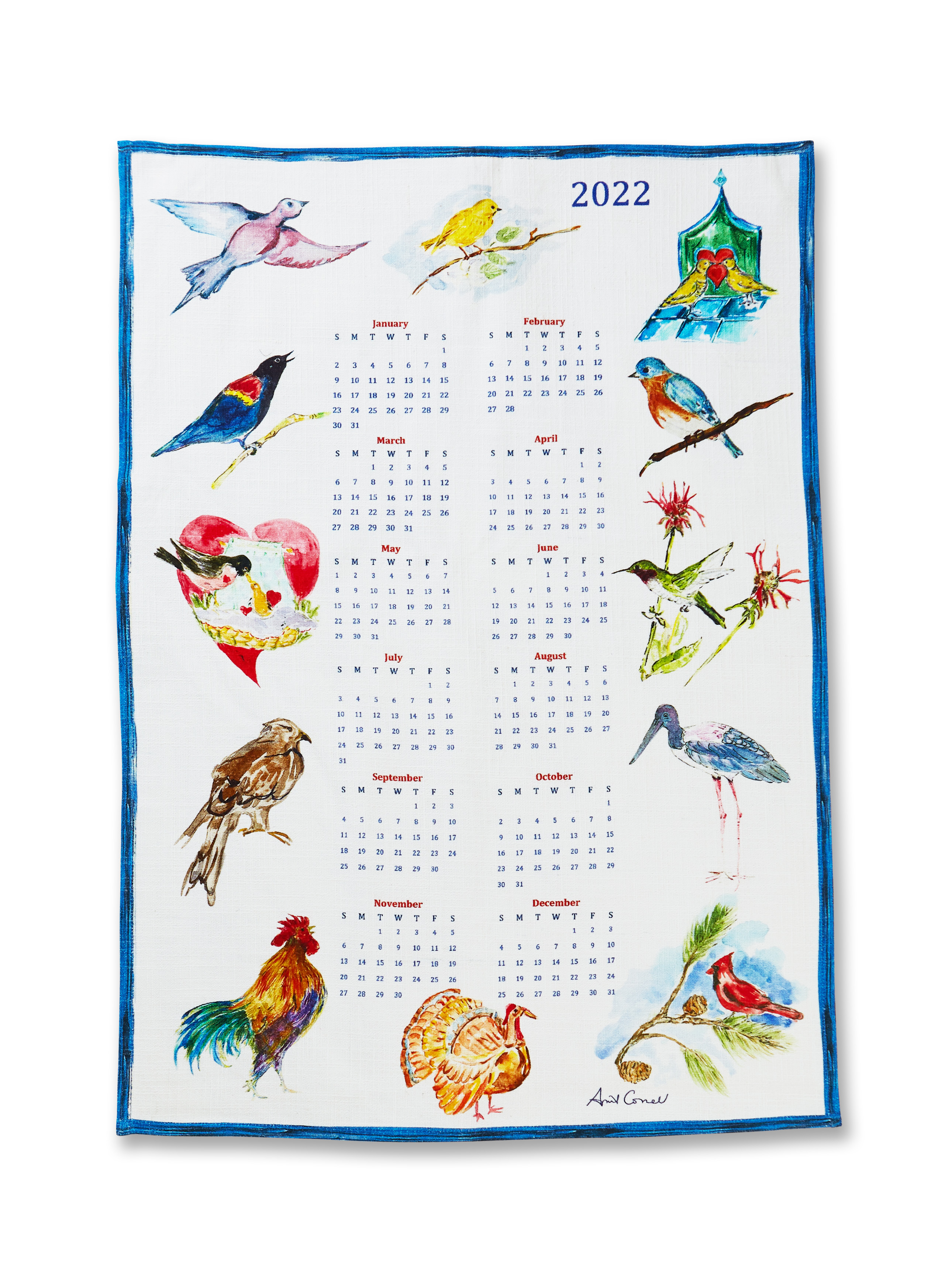 New for April, she has created two collectible 2022 calendar tea towels. Birds, shown here, has her signature artwork with birds depicting what is typical for that month. Great gift for the April Cornell lover! 100% Cotton.