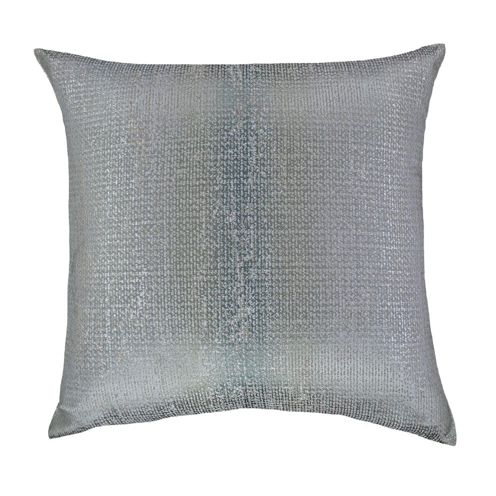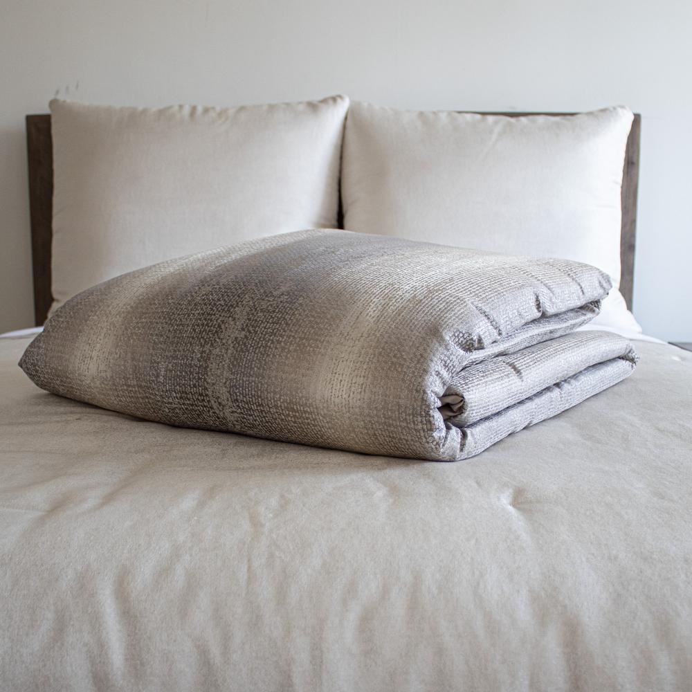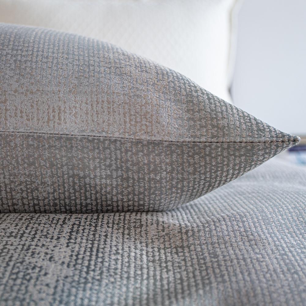 Ann Gish's Anguilla Collection is shimmery, soft and is available in two color ways. It gets its name from the Caribbean island. This is a subtle ombre jacquard studded with pockets of silver that resemble the sand at the bottom of a lagoon. illows have a knife edge finish and includes feather/down insert and zips closed. This throw is padded and reverses to solid-color Duchess satin. Duvet is lined in soft cotton and has a zipper closure.