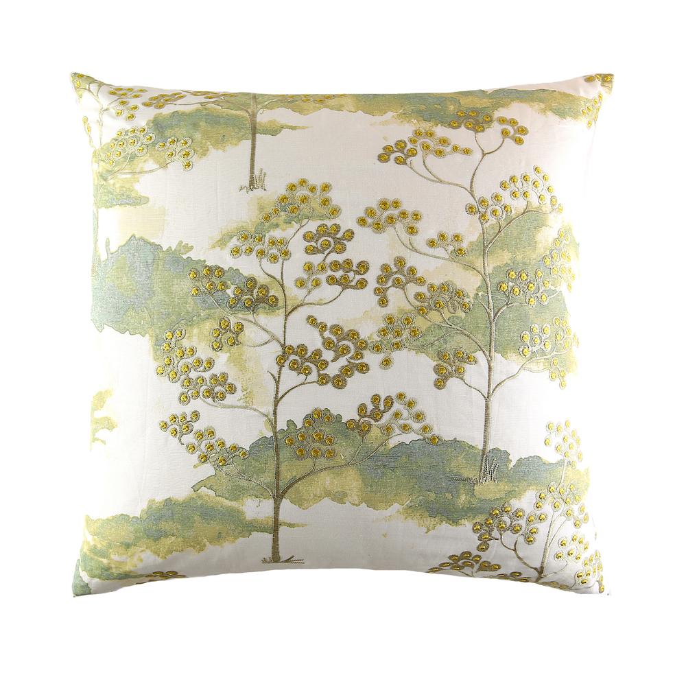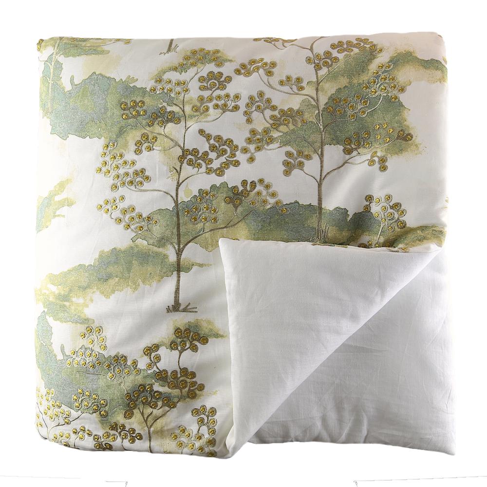 Ann Gish's Avalon Collection was inspired by the Arthurian legend. A soft linen is printed with gradated mists and over-embroidered in taupe and gold. The duvet cover and the pillow reverse to fine cotton and have a zipper closure. The duvet covers have topstitched flanges. Pillow has a knife edge finish. Feather & down fill included for the decorative pillow. The throw is lightly padded, reverses to a solid linen and has graham ties.