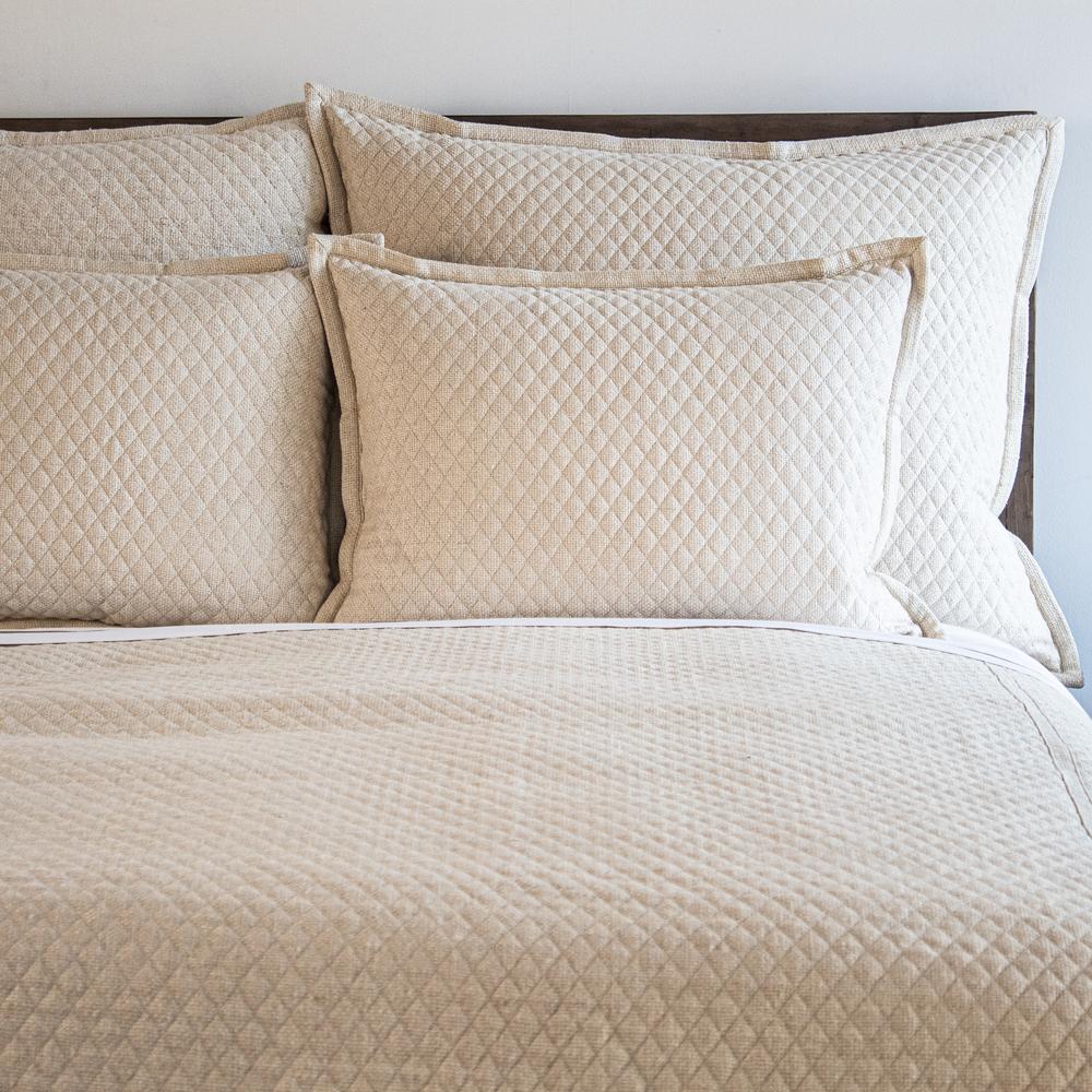 Ann Gish's Silk Basketweave Quilted Collection is a classic 1 inch diamond quilted coverlet that has plain silk bands at joining seams as well as 1 inch wide banding around the edge. The collection is lined with cotton sateen. The Quilted Basketweave collection is available in quilted coverlets, shams, & box spring covers. It is available in natural and in ivory. 100% silk. 100% cotton lining.