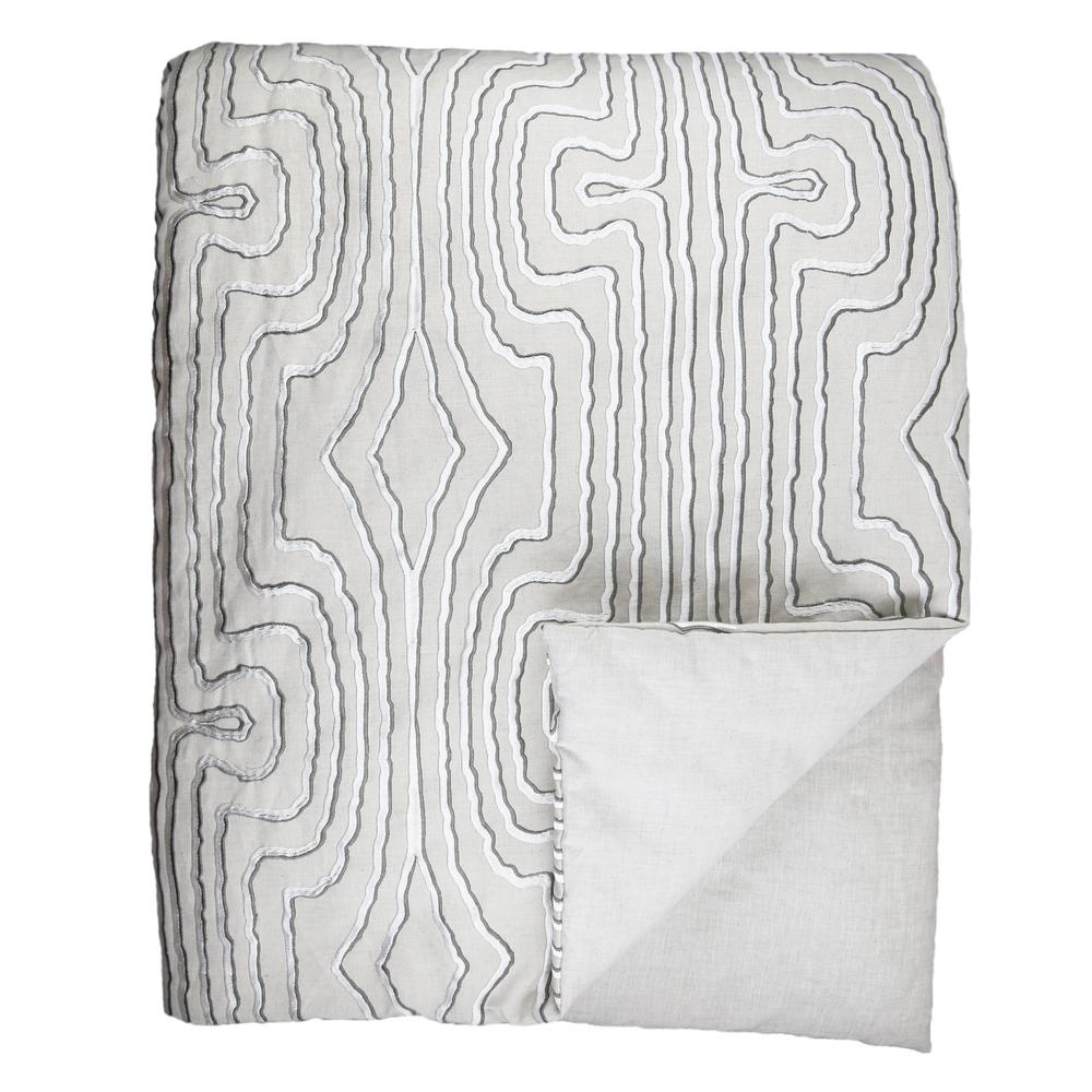 Ann Gish's Contour decorative pillows and foot quilt are a mix of a dramatic with an organic design. The palette is neutral with accents of white and charcoal embroidery. The pillow includes a feather/down insert. The throw is lightly padded and also reverses to a neutral linen. The finish on the foot quilt and pillows is knife edge. Cut fabric has an 17" horizontal repeat and a 30" vertical repeat. 100% linen.