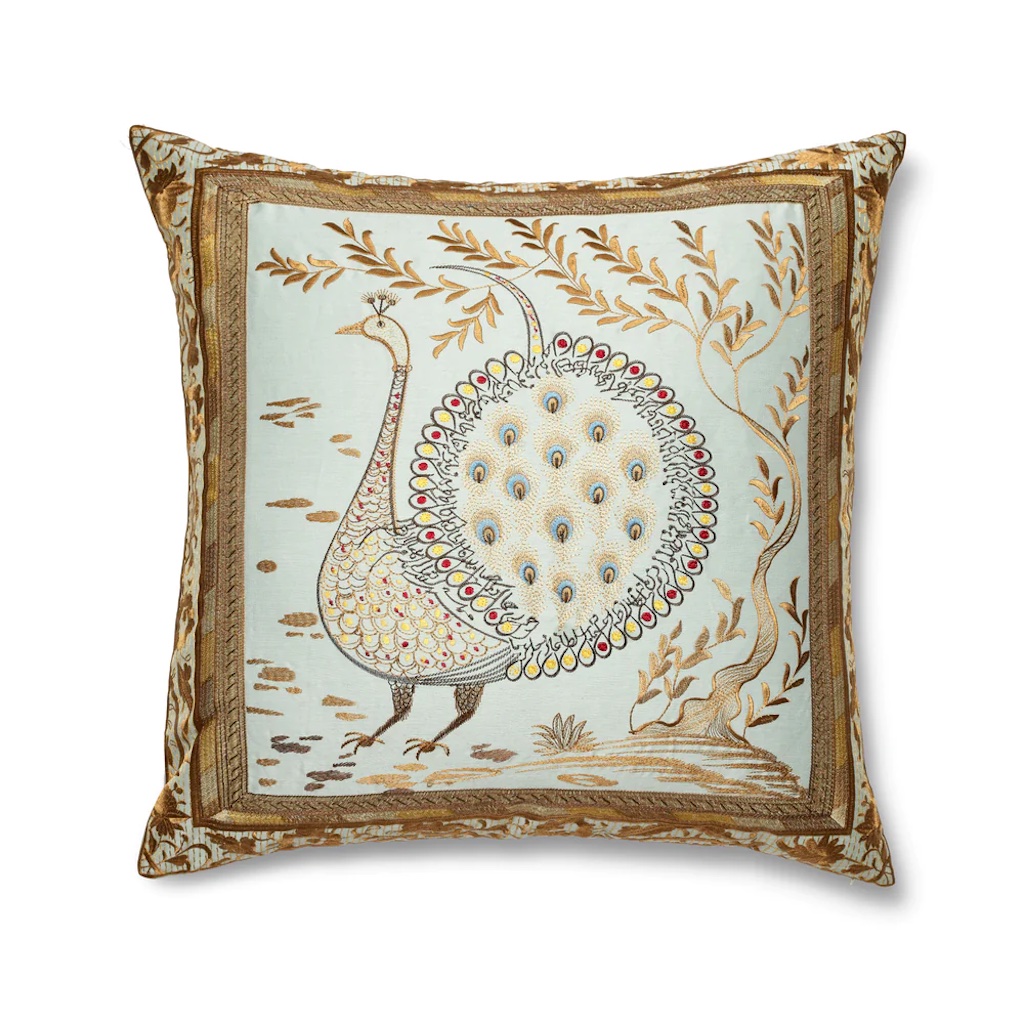 Divani Peacock Pillow is a delightful embroidery that features a Divani script in the peacock’s tail, consisting of blessings for an Ottoman Sultan. Part of The Met x Ann Gish. 14% Poly 43% Viscose 43% Linen.