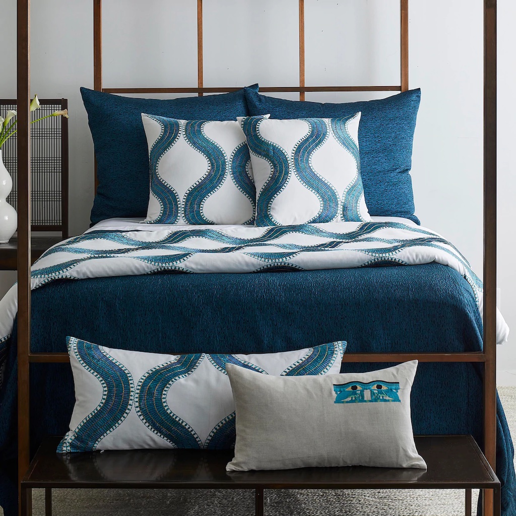 Ann Gish's Egypian Collar is part of The Met x Ann Gish collection. This design of an elaborately beaded collar is from the Tomb of Wah. It is reinterpreted as a serpentine motif for the Met x Ann Gish collaboration. Padded throw accents the foot of the bed. Throw reverses to solid linen/cotton. Lightly padded with poly fiberfill. 60% linen 40% cotton. Pillows are 60% linen 40% cotton.