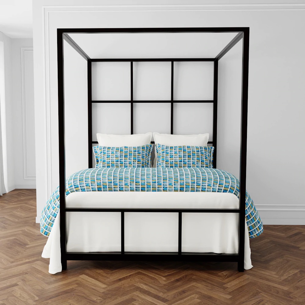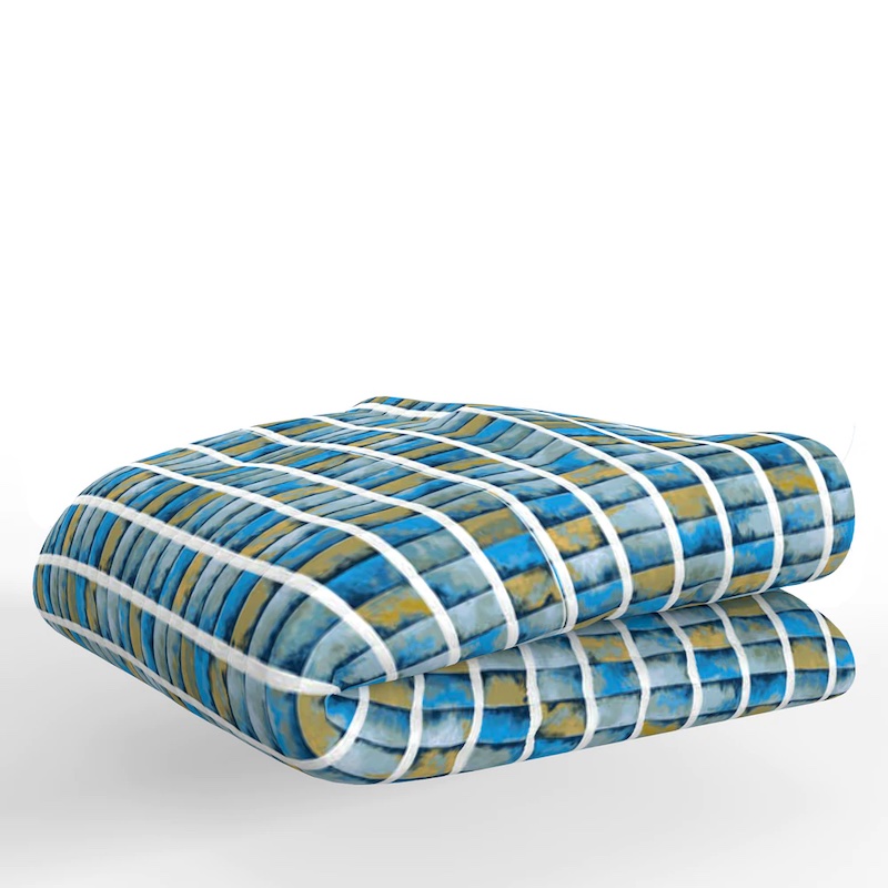 It is inspired by a faience panel from Egypt's OId Kingdom period, we reimagine the shades of azure in a jacquard with embroidered lines. The duvet cover is 73% Viscose 18% Cotton 9% Poly. It has a hidden zipper and reverses to fine cotton. Shams have a hidden zipper and self-reverse. Deco Pillow is 24x24" with hidden zipper and feather/down fill. Foot Quilt is padded with poly fiberfill.
