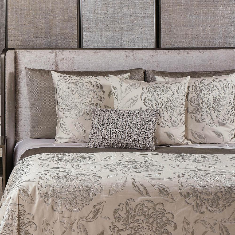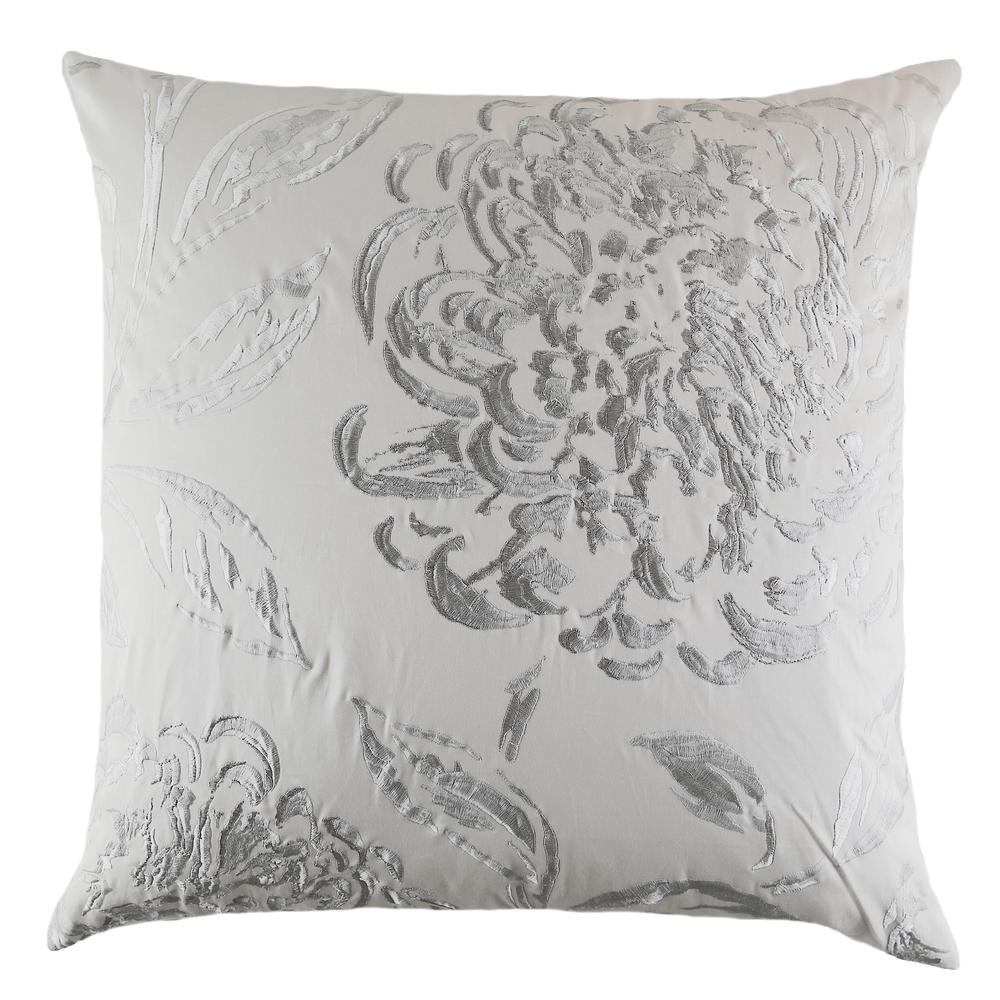 Ann Gish's Glory Collection is has a silver on silver embroidery that outlines elegant oversized chrysanthemums. Soft ivory cotton twill ground sets off the motif for a more dramatic effect. Duvet cover reverses to a fine cotton lining. The foot quilt reverses to a cotton satin and is lightly padded. Feather & down fill included for the decorative pillow. Pillow has a zipper closure.