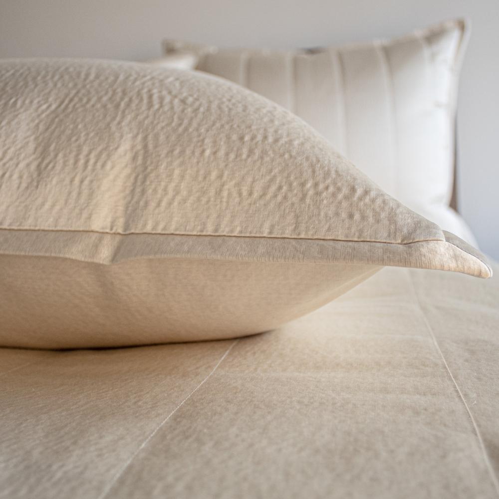 Ann Gish's Hammered Collection says Hollywood glamour. embodied in this luxe, satin fabric. Quilted coverlets and oversize pillows are mixed with un-quilted duvets and shams. Hammered has a retro modern 5 inch vertical channel-quilted design. The Hammered coverlet reverses to cotton sateen lining. The duvet and shams both have 1/2" inserted flange. 34% polyester and 66% cotton satin.