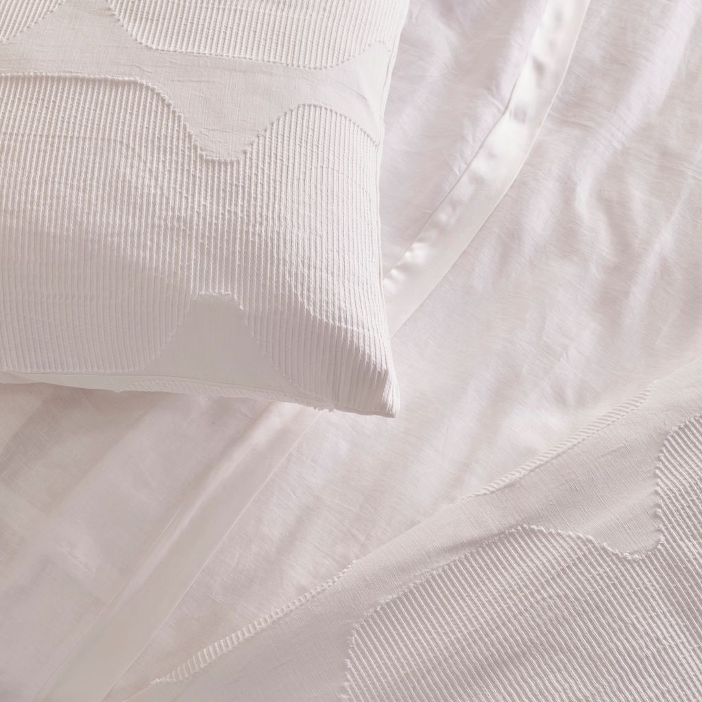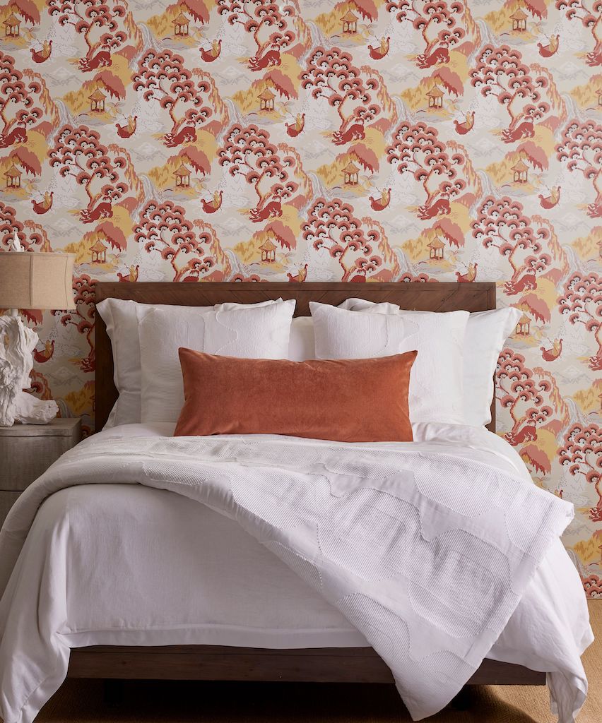 Ann Gish's Lantern was inspired by Japanese lantern, this textural fabric is available in white on white and red on black. Modern and clean. Part of The Met x Ann Gish. You can order Lantern by the yard to create custom bedding and window treatments.