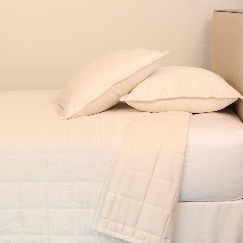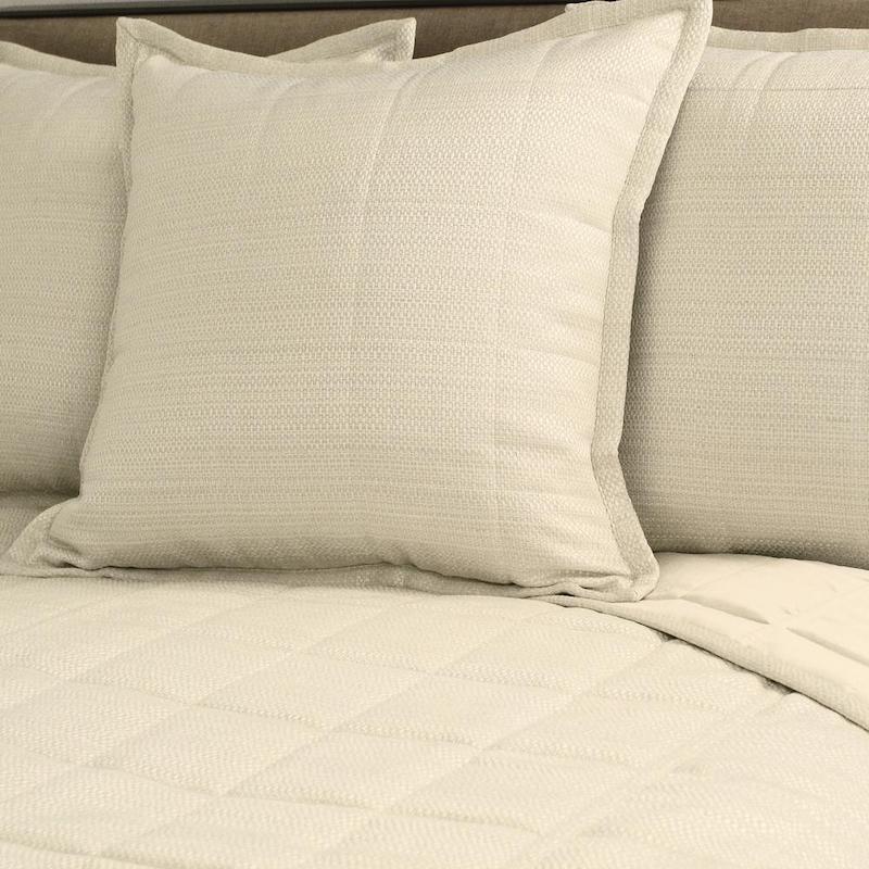 Ann Gish's Texture coverlet set is a coverlet and european shams. Texture is an interwoven pattern and then quilted into 4x4" squares. It feels textured and rich. The fabric has the look of grasscloth. King set has three shams and the queen set has two shams. This collection is machine washable. It is available in several colors. 100% polyester.