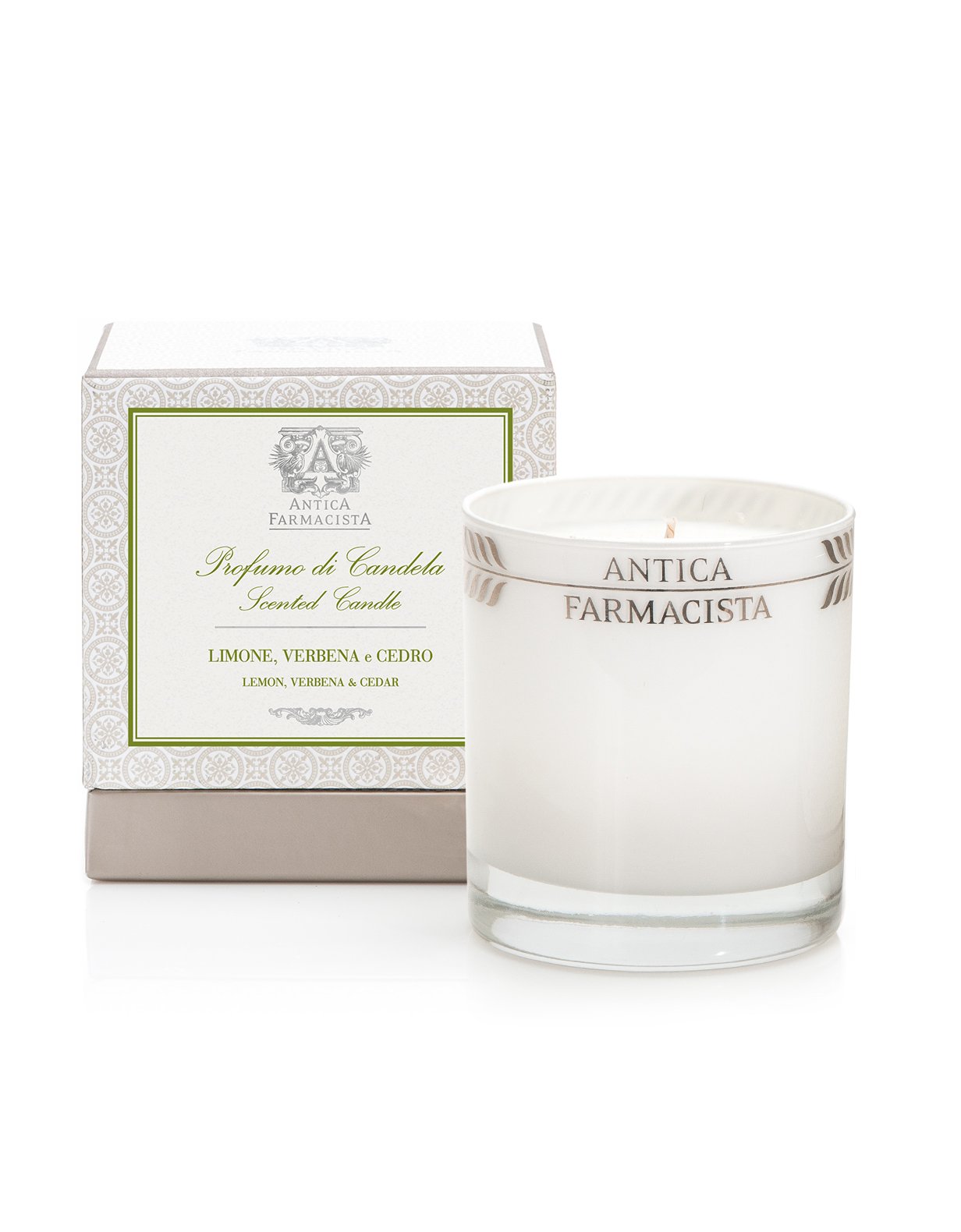 Antica farmacista's signature soft white glass, filled with our soy-paraffin wax blend, results in 60 hours of beautifully scented illumination. Each decorative box includes a set of Antica's signature matches.