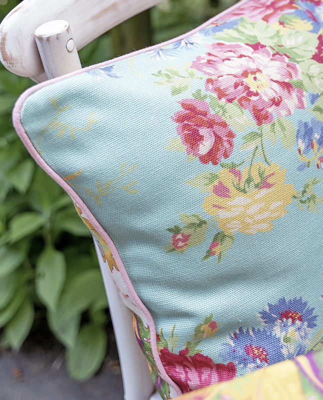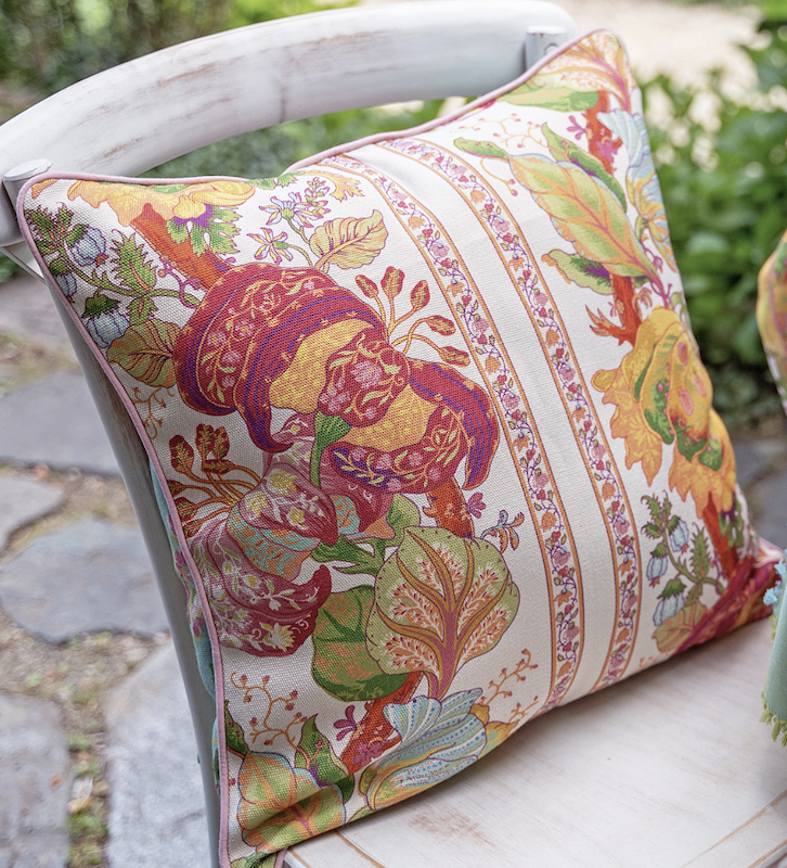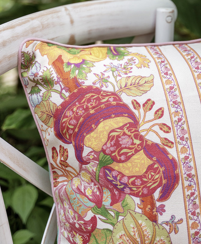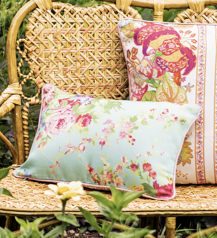 April Cornell's Cottage Rose Outdoor Cushion Cover is comprised of hand crafted flowers, uplifting signature color and a deep commitment to quality and craft. The outdoor cushions reverse to Blooming Jungle fabric. They are corded in pink. Zipper Closure. Signature April Cornell Print. 100% Polyester.