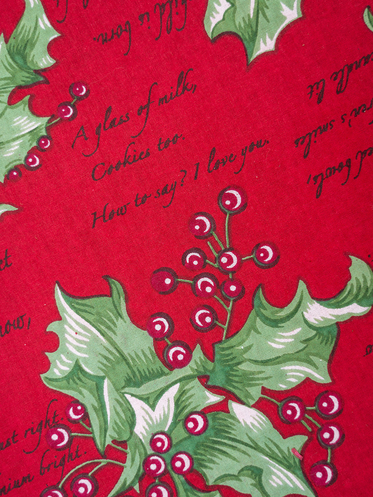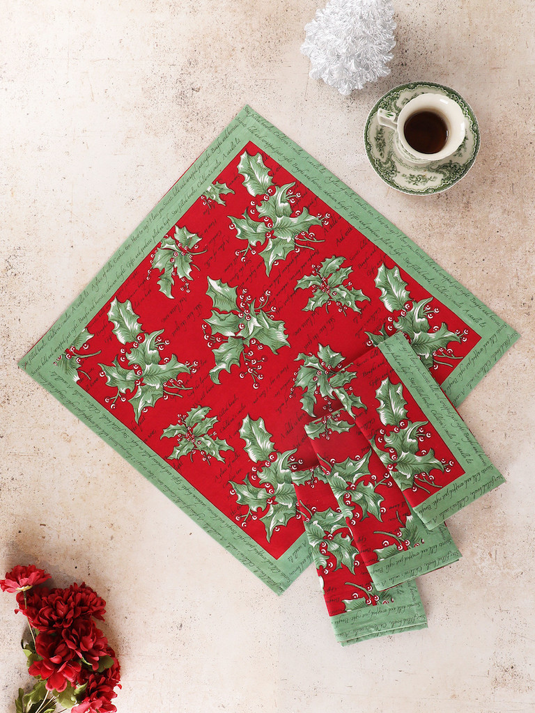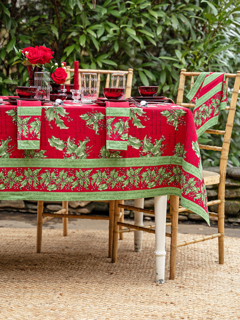 April Cornell's Holly Song in Red napkins are quite charming. They have lovely lyrical sentiments penned in April's inimitable style. That pattern adds a touch of whimsy and wonder to her signature Holly print. 100% Cotton. Signature April Cornell print!