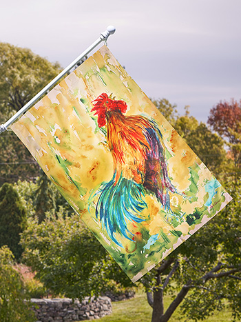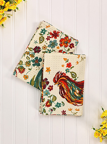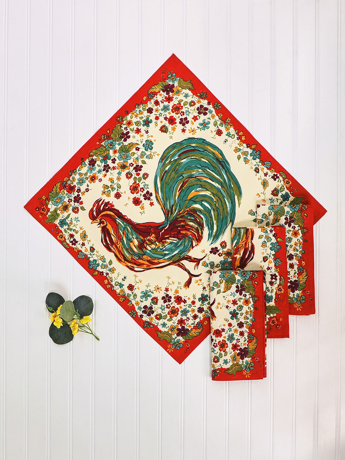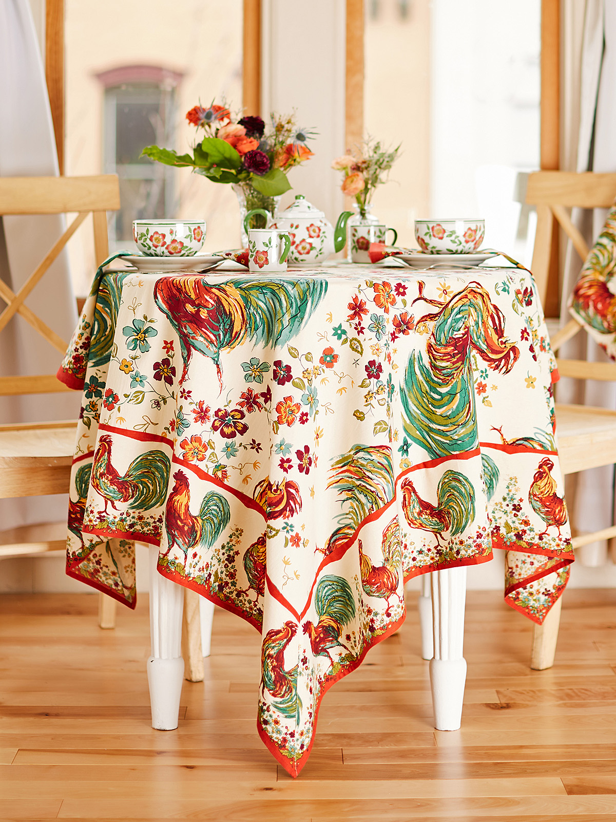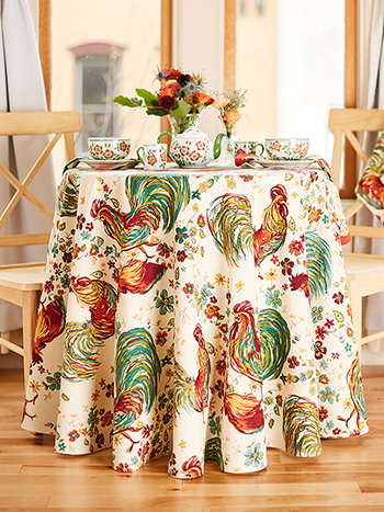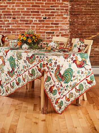 The Rooster design from April Cornell will become an instant classic. Rendered in vivid shades of red and green on an ecru background, this could lend itself to a country Christmas. Attached border with mitered corners with french seams. Signature April Cornell print.100% cotton.