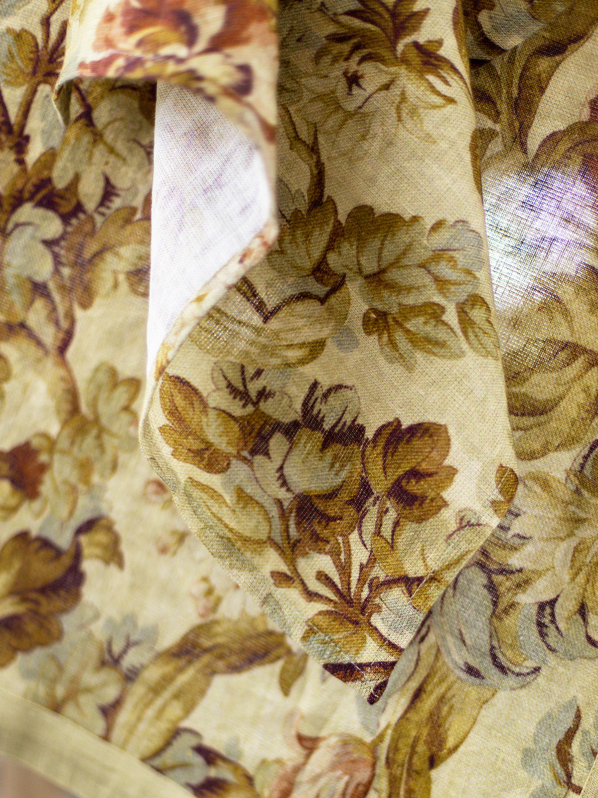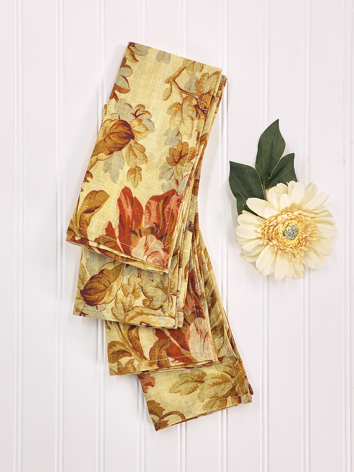 From April Cornell -- comes the Sojourn Linen napkins with a hemstitch finish. Classic fall colors are printed on a cotton/linen blend (20% cotton and 80% linen). Coordinating cloths available by special order. Or pair them with the Sojourn velvet runner.