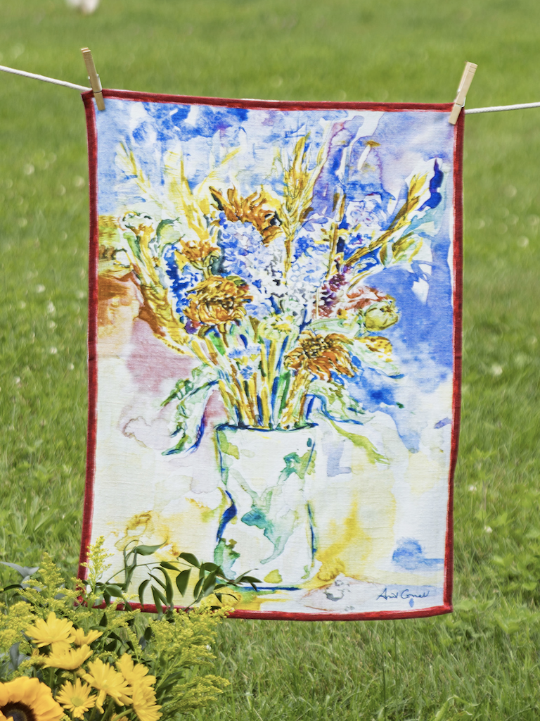 April Cornell's Telluride Tea Towel has a ceramic vase, a bouquet of local flowers, and a blue mountain sky. This painting expressed my enjoyment of Telluride, a beautiful mountain village in Colorado. Enjoy your places and celebrate the beauty of our blessed planet! Art is rarely (if ever) this practical, and our curated cotton weaves are made for soaking up all of life's little messes! April's Artwork. 100% Cotton