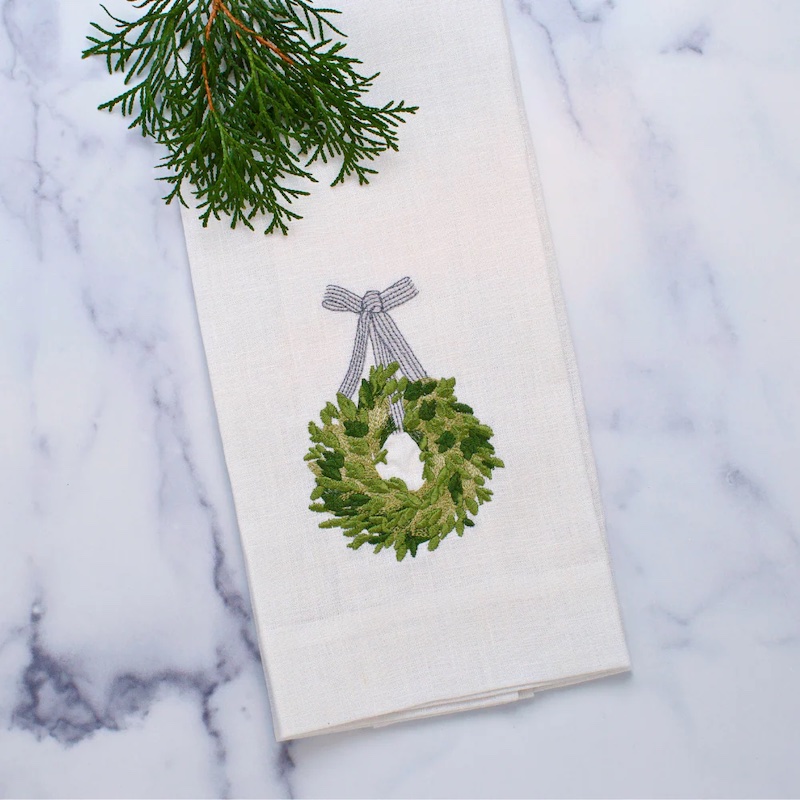 Arte Italica's Towels are beautiful. Add charm to your kitchen with the Boxwood Wreath Linen Towel! Featuring a festive wreath tied with a bow, this towel is perfect for the holiday or any season. Made of 100% linen, it is both functional and decorative. Machine wash and iron flat for a crisp look. Tab on back for hanging. 100% linen. Made in Ukraine.