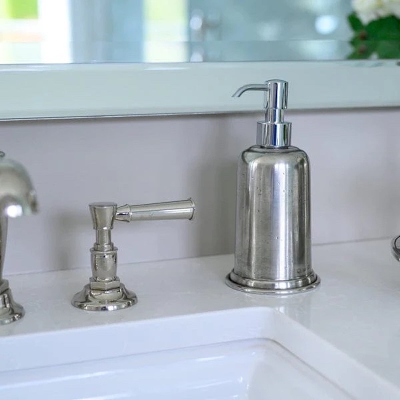 Roma Soap Pump is handcrafted with Italian pewter, these accessories create an elegant bath in any home. They transition from clean and contemporary to traditional with ease. Made in Italy.