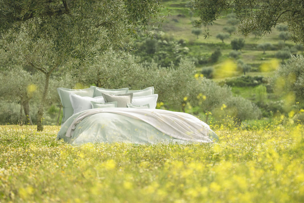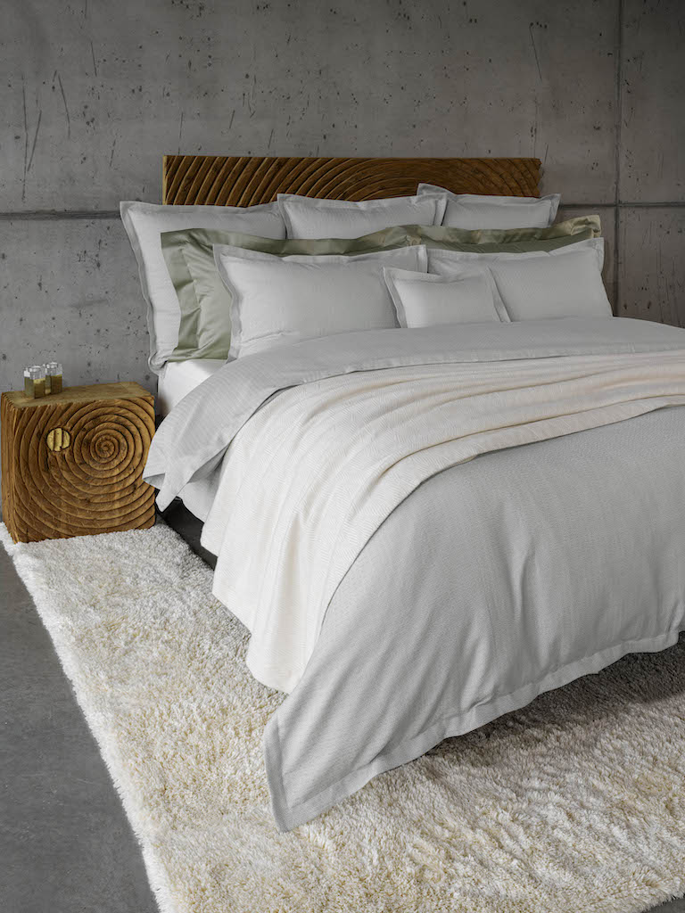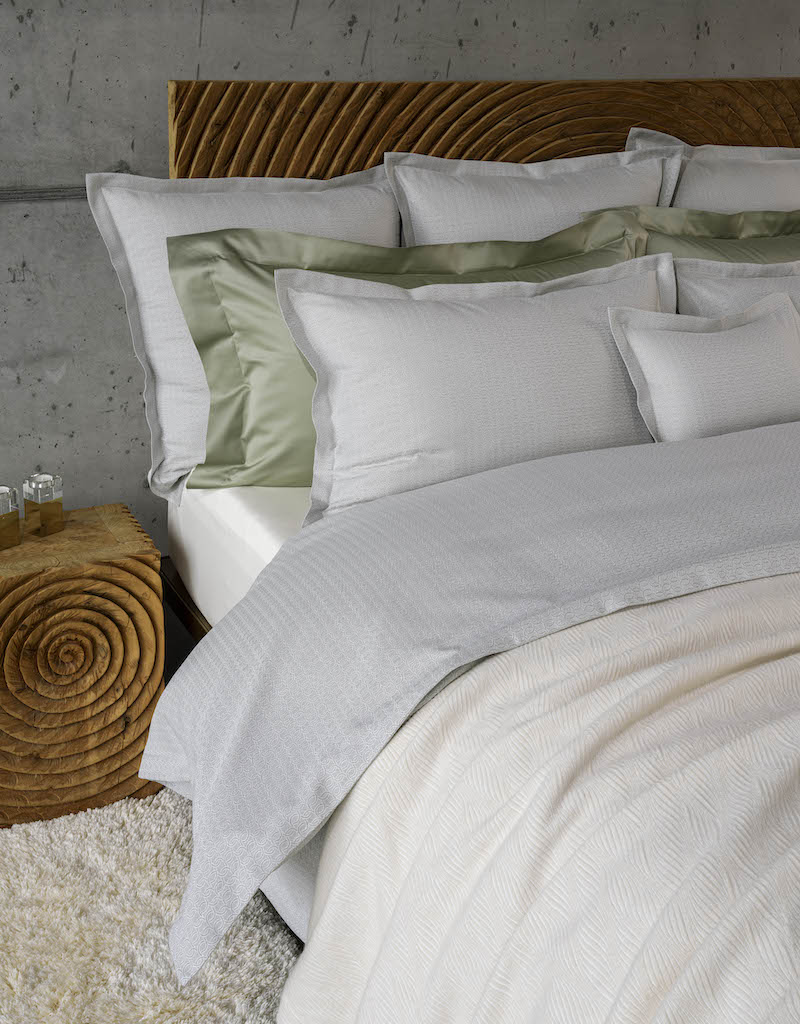 Celso de Lemos' Bijoux features a captivating jacquard design in shades of green. Inspired by lush tones of olive, jade and laurel, it draws its inspiration from the intricate beauty of jewelry chains, with interlaced ovals . A blend of cotton and viscose, the jacquard is 70% extra long staple Giza Egyptian cotton and 30% viscose..