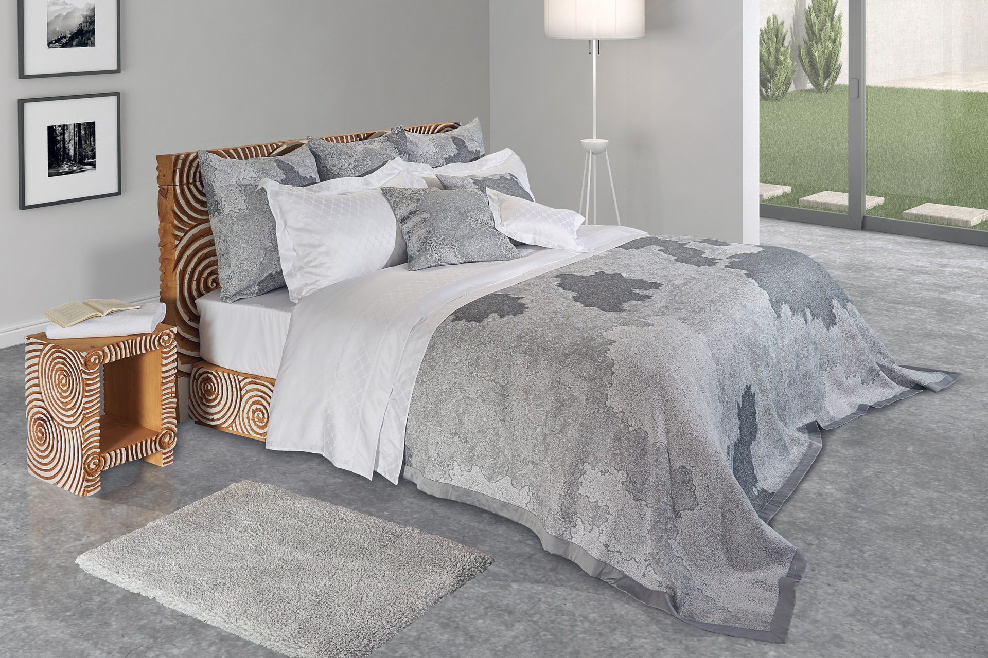 Mundo is a totally modern matelasse manufactured by Celso de Lemos of 70% gize extra long staple egyptian cotton, 15% viscose and 15% lurex -- which gives it its sheen. Available in figue (shades of purple and taupes) and storm (shown). It comes in a queen and king coverlet and euros shams or a 21" decorator pillow.