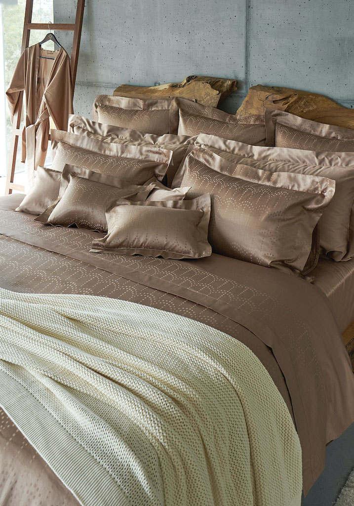 Celso de Lemos Evora is an elegant and charming jacquard in delicious caramel colors, from natural to almond, like the evening colors in the warm savannah-like Alentejo. Evora, capital of the Alentejo: this walled city is adorned with the splendor of Romanesque arches, ancient temples, and gold mines. JACQUARDJacquard 100% Egyptian cotton Giza ELS - 700 thread count.