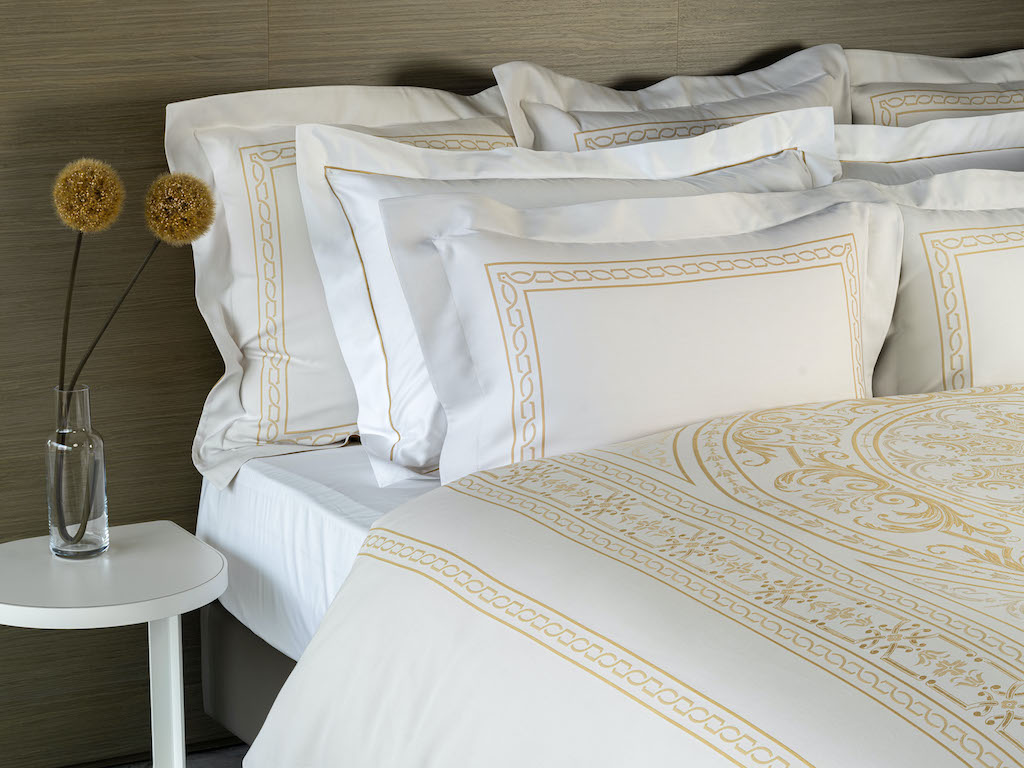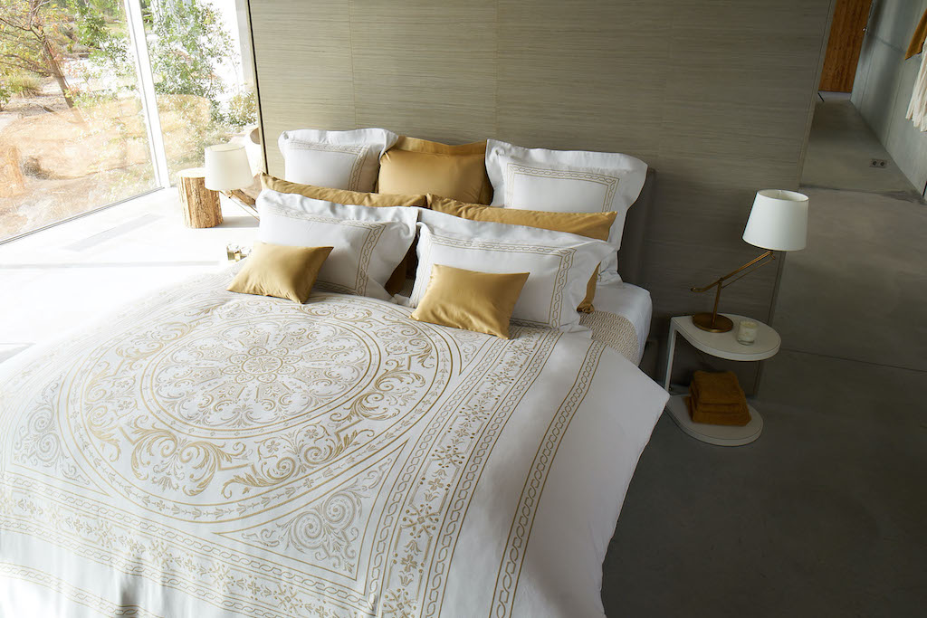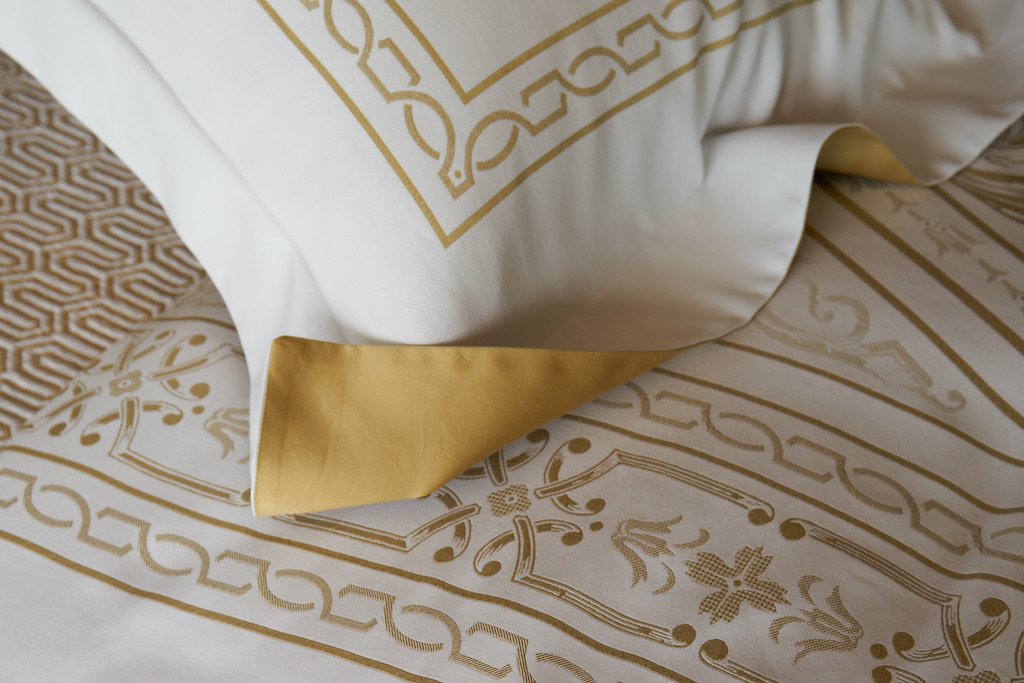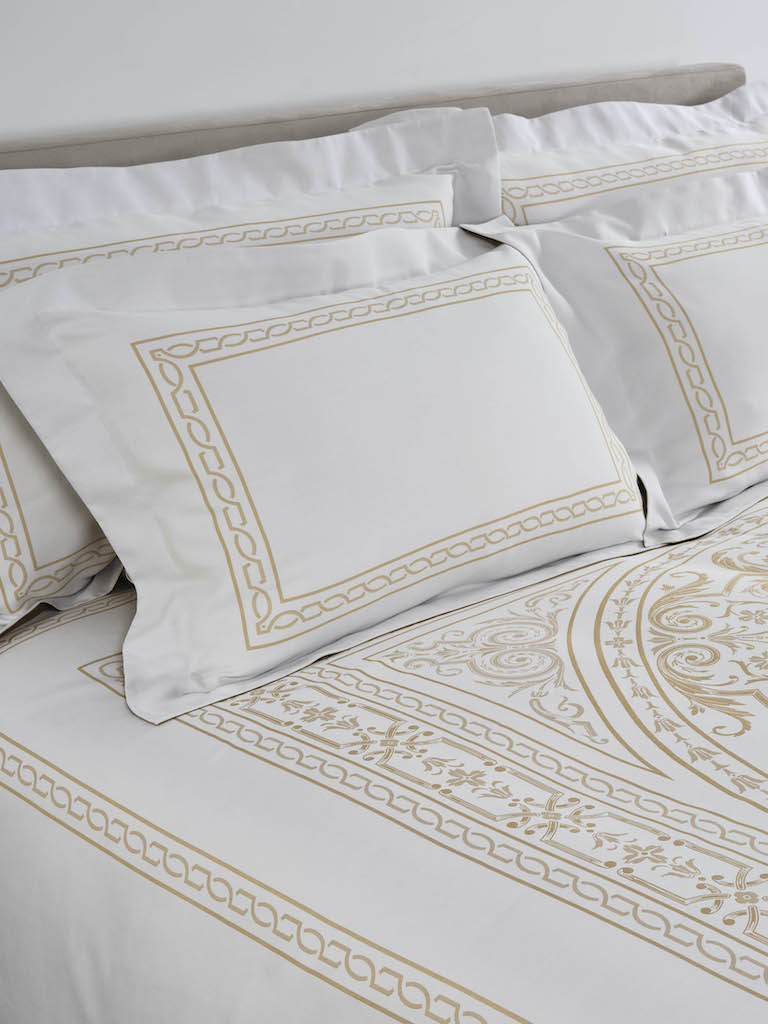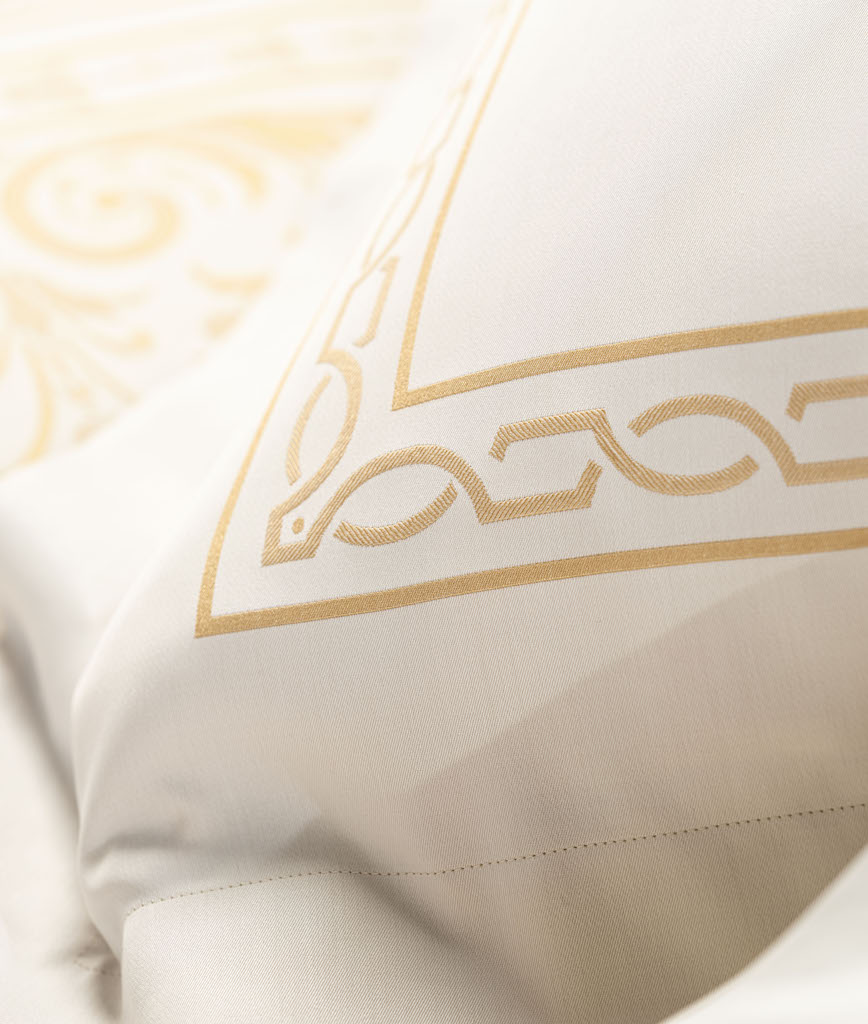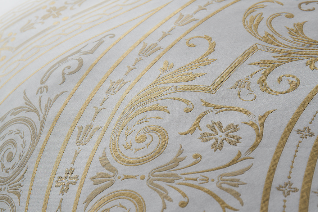 Celso de Lemos Versailles is exquisite. Welcome to the golden age of splendor. This ensemble reflects the grandeur and abundance of royal palaces. A beautifully refined drawing, woven with gold thread.