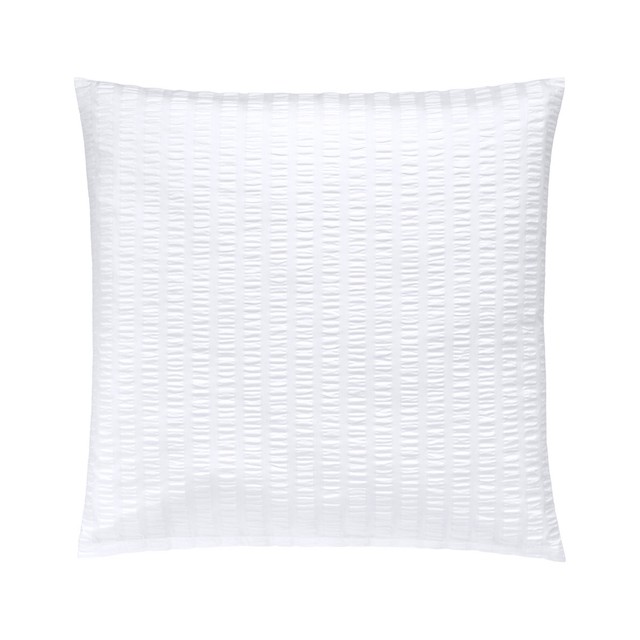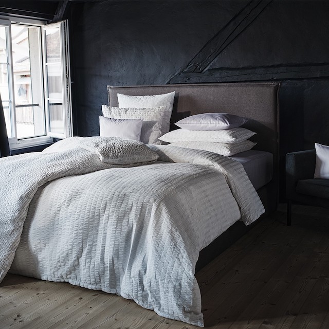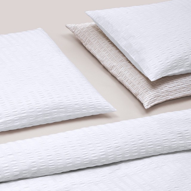 Christian Fischbacher's Flow is a generous stripe design of pure cotton. With its three-dimensional surface and easy-care properties, this popular quality meets the current spirit. The varying tension of the warp threads gives the fabric a pleasant, lively feel. The white surface is soft, non iron and easy-care and a classic in the world of bed linen. 100% Cotton.
