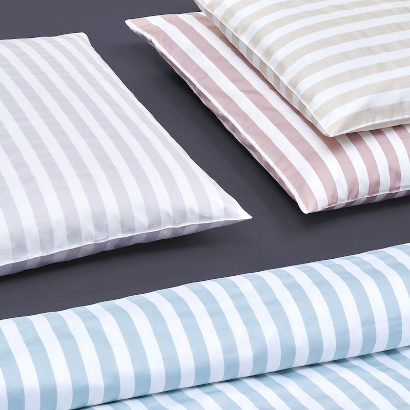 Christian Fischbacher's Calma has stripes that are a timeless classic when it comes to motifs. Printed on our finest cotton satin, pastel accents interplay with the white background. Whether used as a statement piece or combined with other designs, Calma adds a touch of serenity to your bedroom thanks to its understated appeal. Printed Satin. 100% cotton.