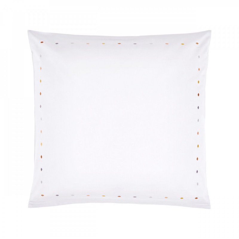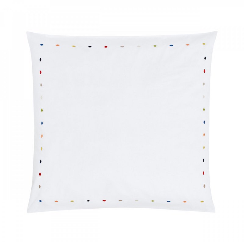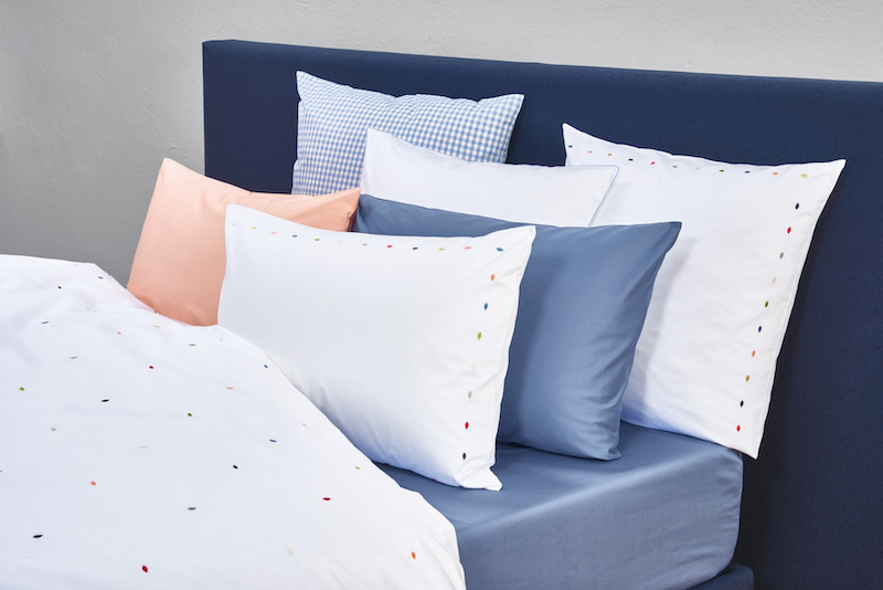 Christian Fischbacher's Collier is playful embroidery produced using sophisticated glossy rayon yarn on the finest cotton satin in Swiss+cotton quality. The shams are decorated by a border reminiscent of a colorful string of pearls. While the duvet has the dots all over. The many colors of the hand-sewn embroidery make it extremely versatile.