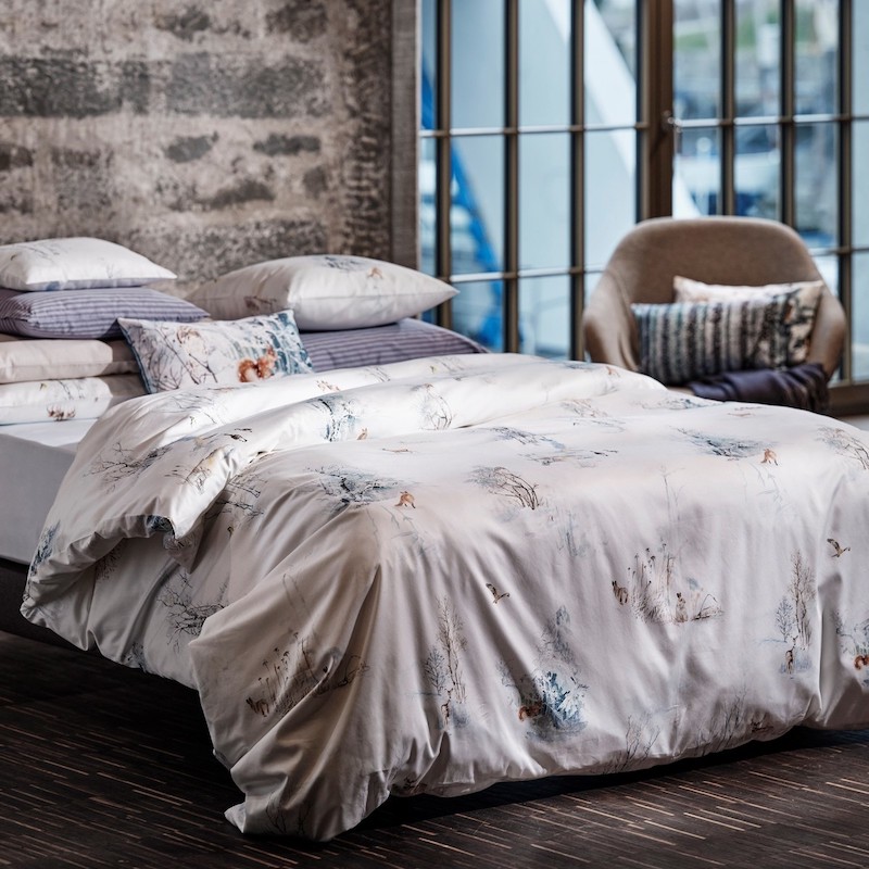 Christian Fischbacher's Finja is an enchanting print design that follows the popular tradition of the Christian Fischbacher handwriting. Fine brushstrokes bring squirrels, snow-covered dwarf birches and the tracks of wild geese in the snow to life. A majestic red kite circles over the winter landscape. Dream-inspiring winter motifs are artistically painted on a white background in soft beige, brown and blue tones. Zipper Closure. 100% Cotton.