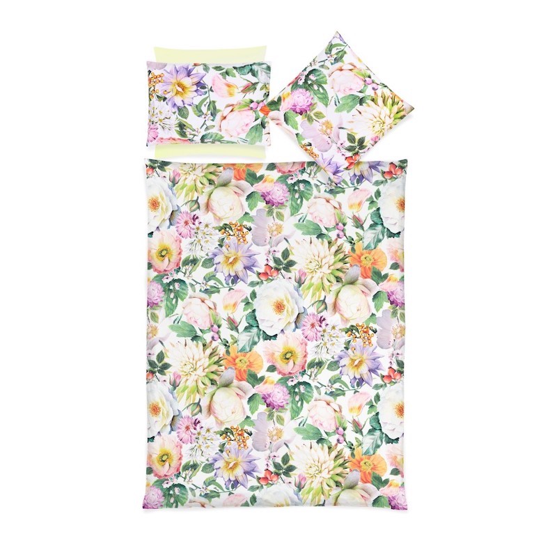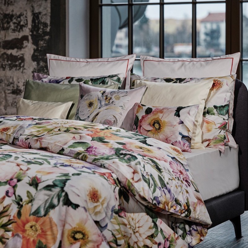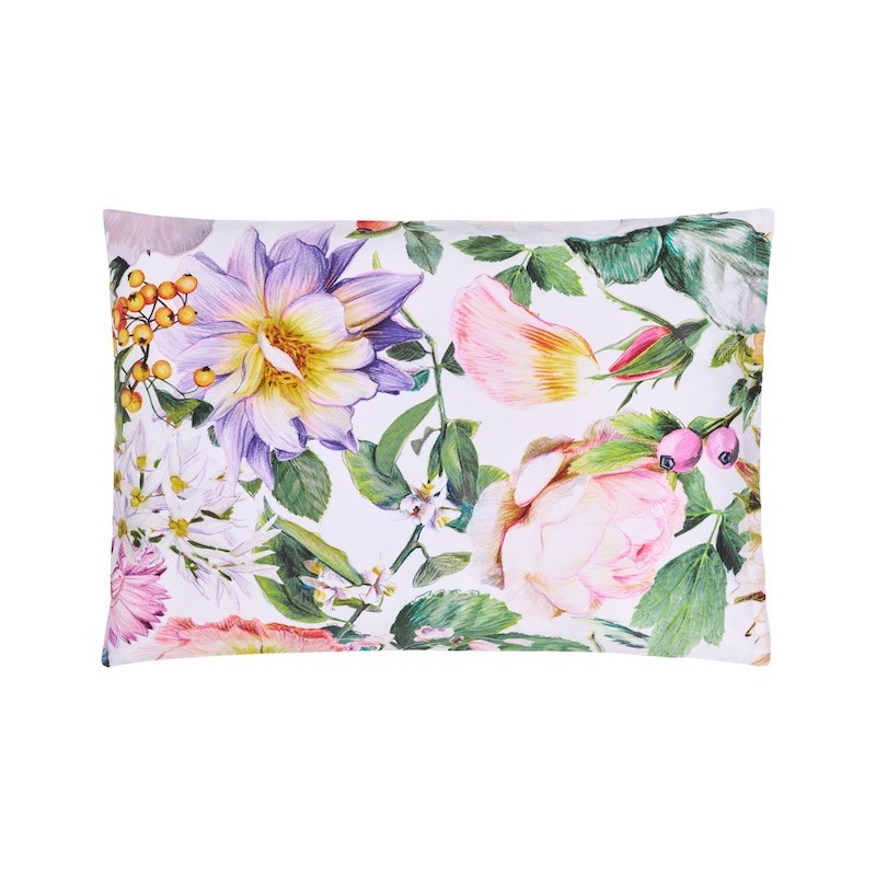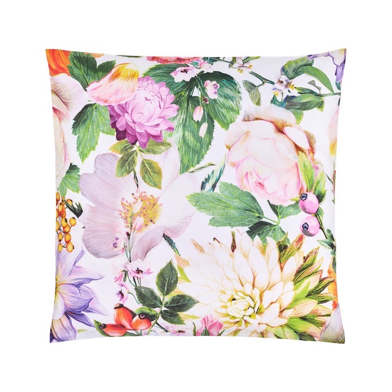 Christian Fischbacher's Fiorenza will bring the magic of Italian gardens into your home. Fiorenza is an extraordinary bed linen with oversized flowers like light roses, purple dahlias and red rose hips adorn the white satin. Inspired by the huge range of flowers found in Italian gardens, the design captures the essence of classic beauty. In the sunlight of late summer, delicate flowers and bright berries glow as a harbinger of autumn to come. Zipper Closure. 100% Cotton.