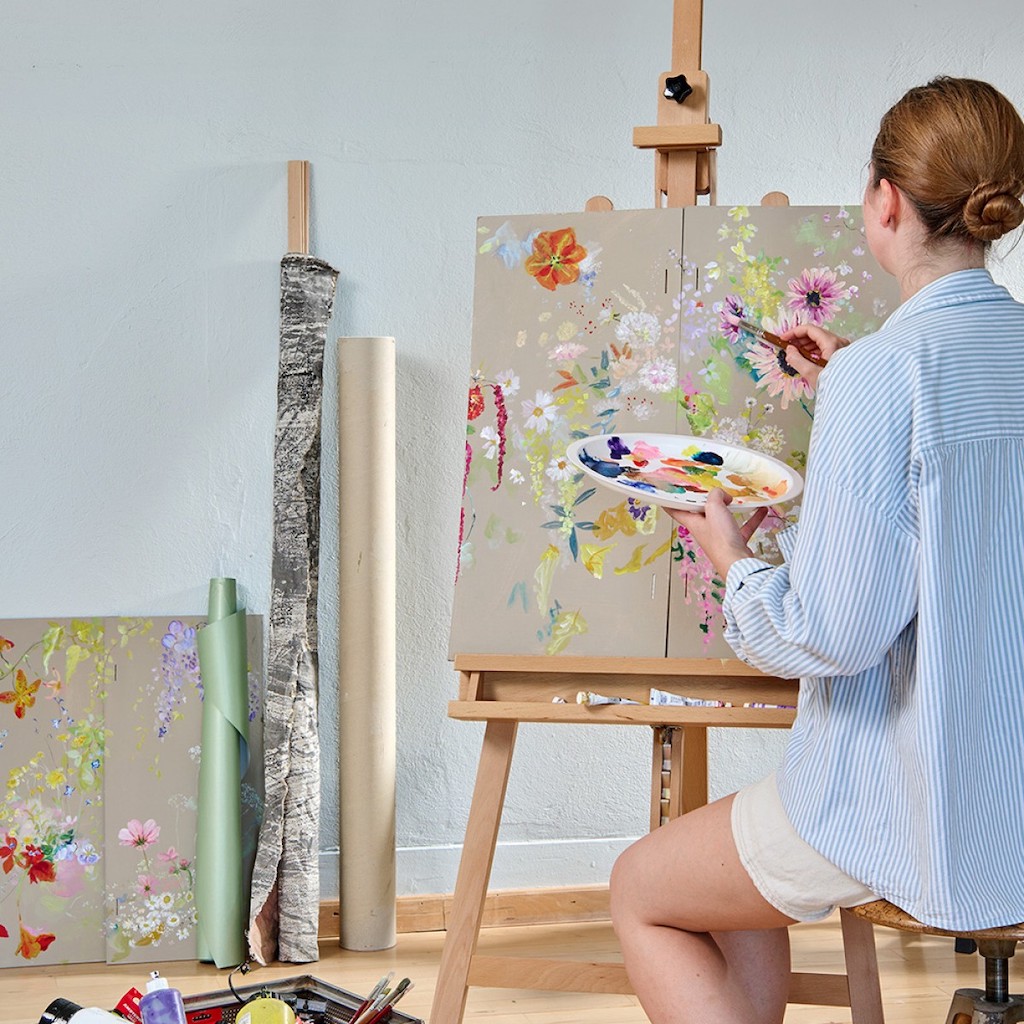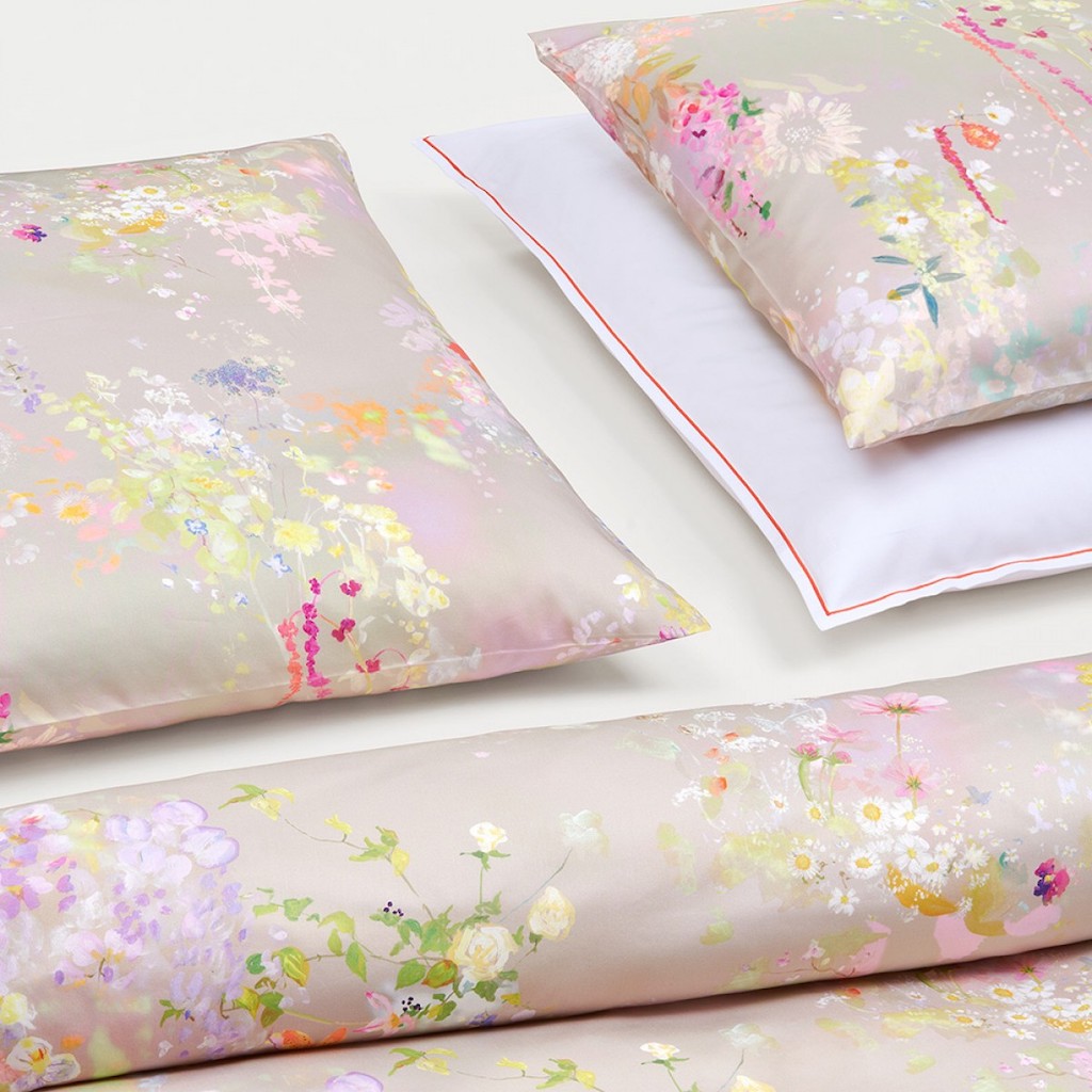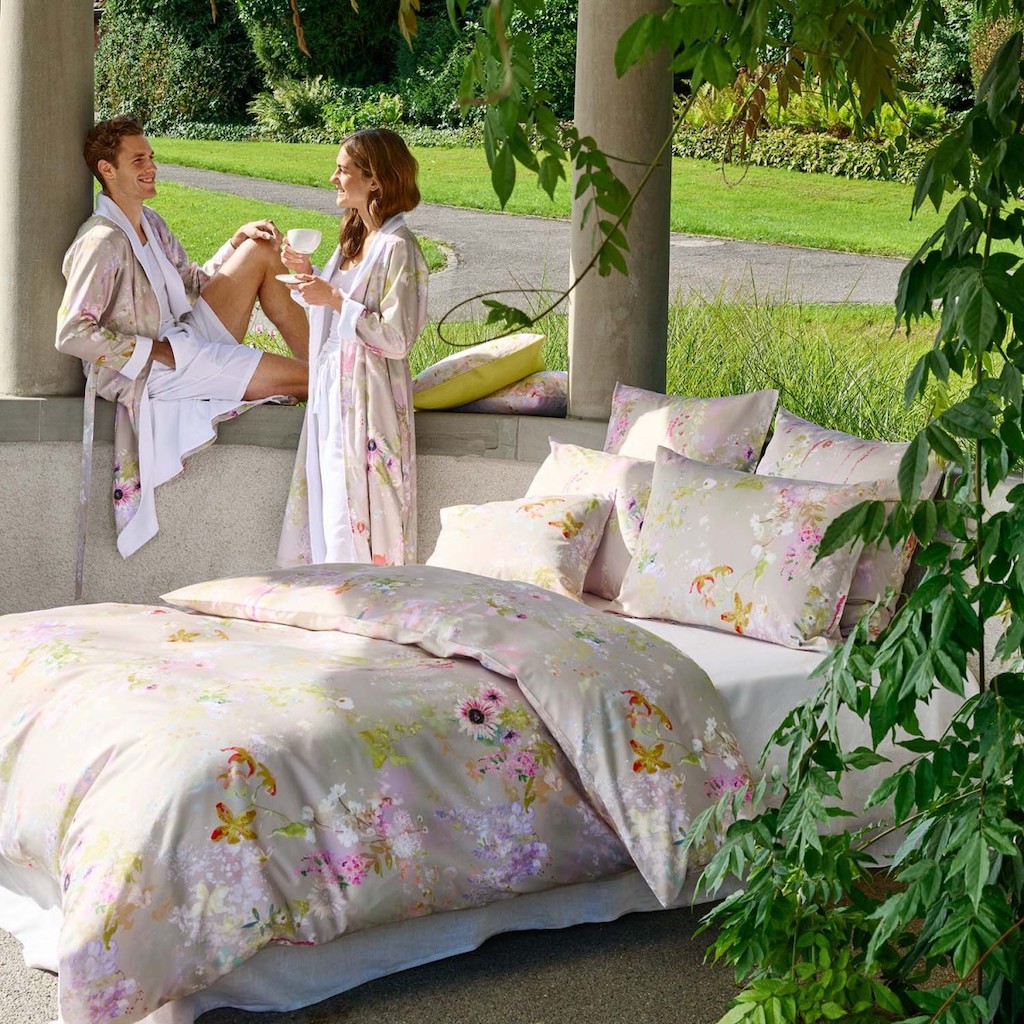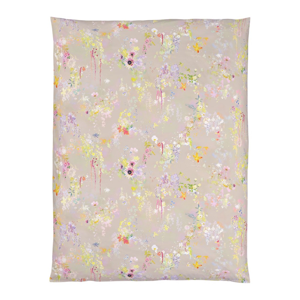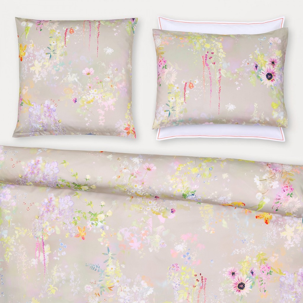 Christian Fischbacher's Mystic Garden is the reflection a light- infused day in an enchanted garden. The hand- painted plants and flowers appear to be bathed in diffused light, gently blending with the beige background. Subtly reflected light dances across the fabric, creating the impression of actually walking through an enchanted garden. 100% cotton.