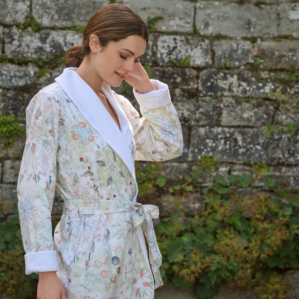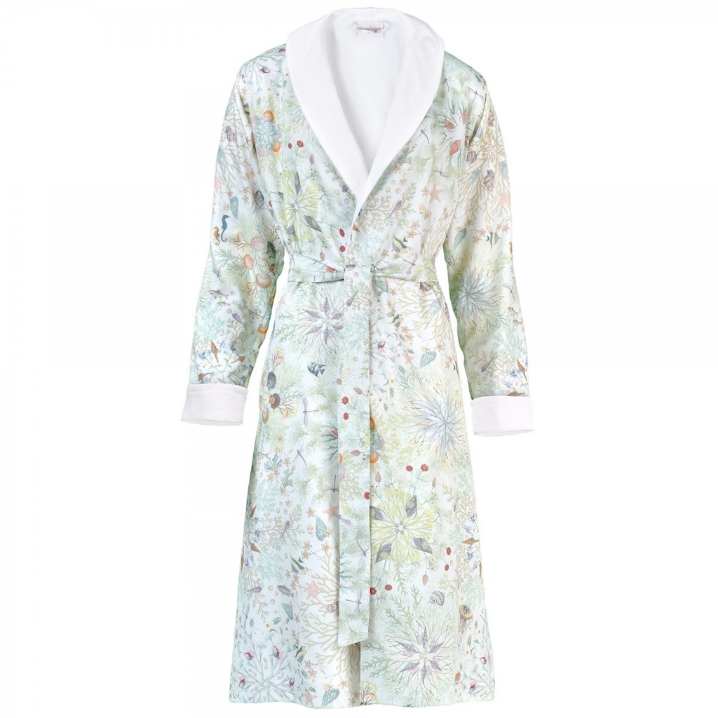 Christian Fischbacher's Neptuna's design is revealed as a creatively developed deep sea environment with delicate shades. Coral, shells and pearls are playfully arranged in circular decorations, creating kaleidoscope- like structures where fish and seahorses lightheartedly glide around. It feels like exploring the sunken city of Atlantis – but without the water. Elegant turn-down collar and side pockets for practical comfort. 100% cotton satin.