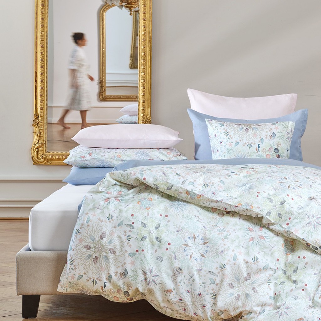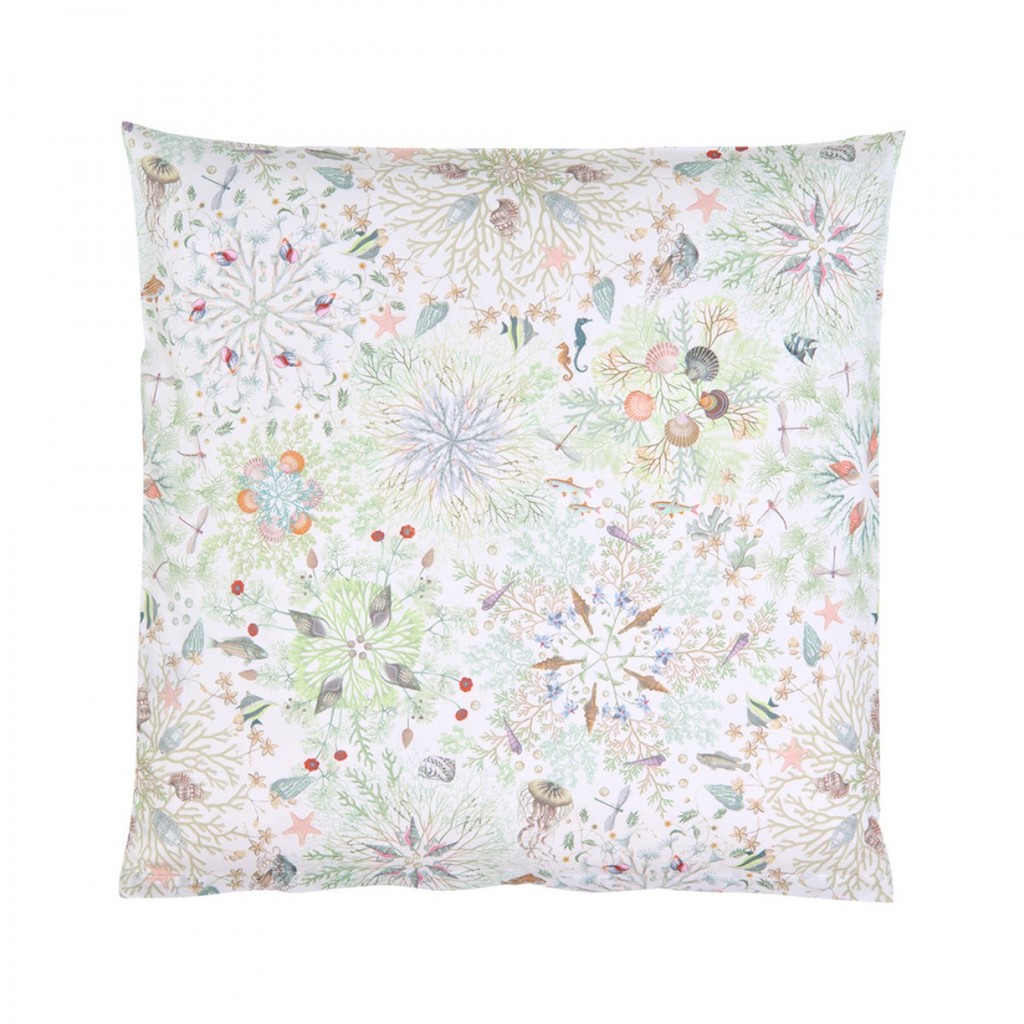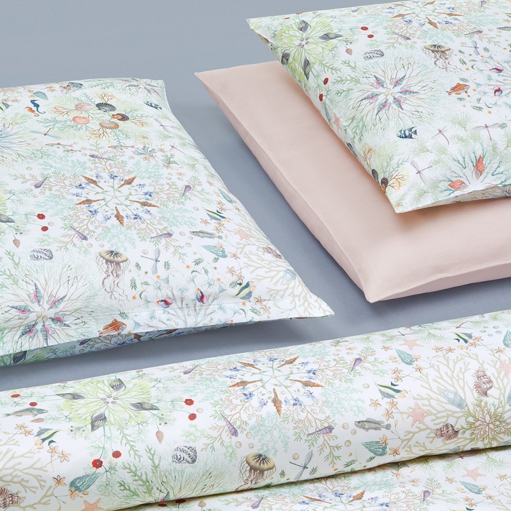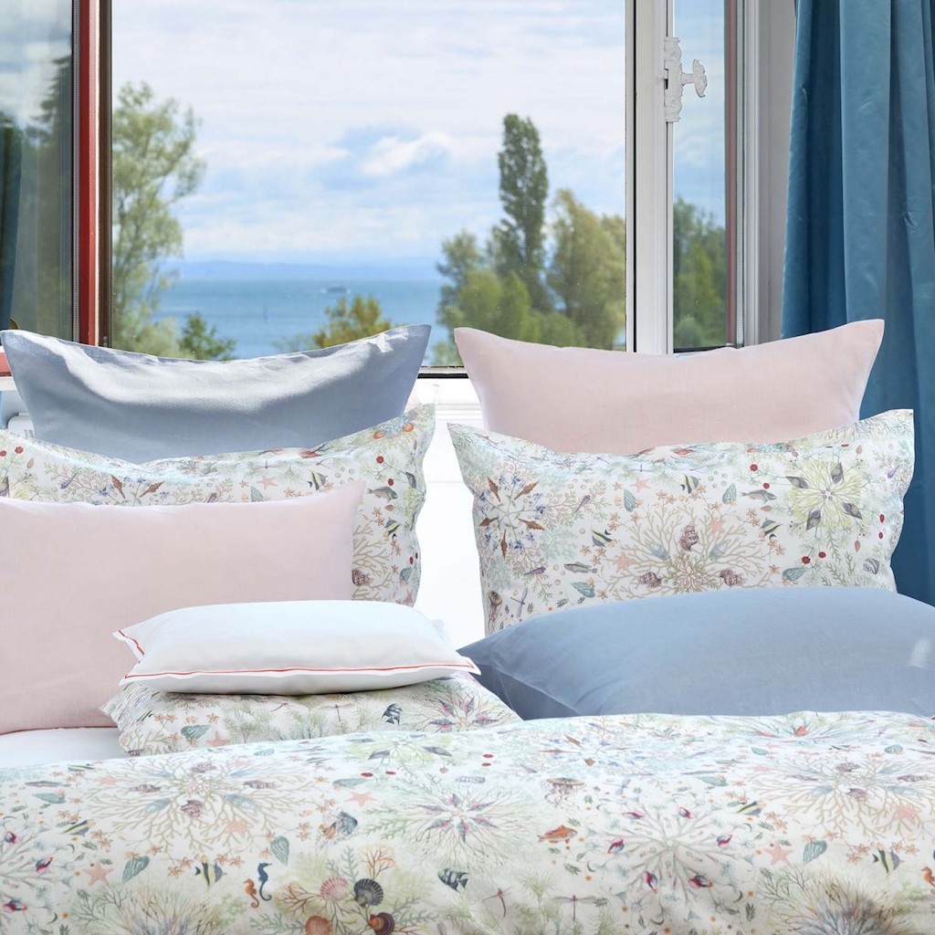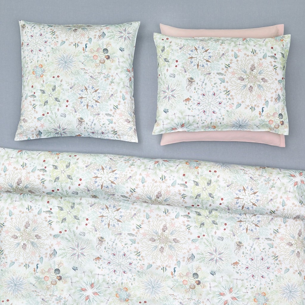 Christian Fischbacher's Neptuna's design is revealed as a creatively developed deep sea environment with delicate shades. Coral, shells and pearls are playfully arranged in circular decorations, creating kaleidoscope- like structures where fish and seahorses lightheartedly glide around. It feels like exploring the sunken city of Atlantis – but without the water. 100% cotton.