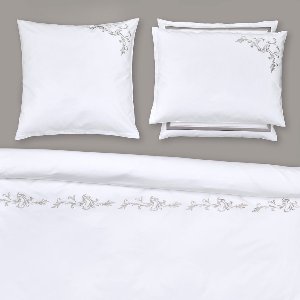 Christian Fischbacher's Snow Lace has delicate ornaments of shimmering white yarns that rise up on the flawless satin ground of this luxurious bed linen. The art of white embroidery, once performed with devotion by skilled hands in the countryside in winter, has been reborn in the elegant Snow Lace design. A tribute to this noble textile tradition, realized with finely shimmering white, ivory and silver yarns, which will embrace your nights in pure luxury and timeless elegance. Satin Embroidered. 100% cotton.