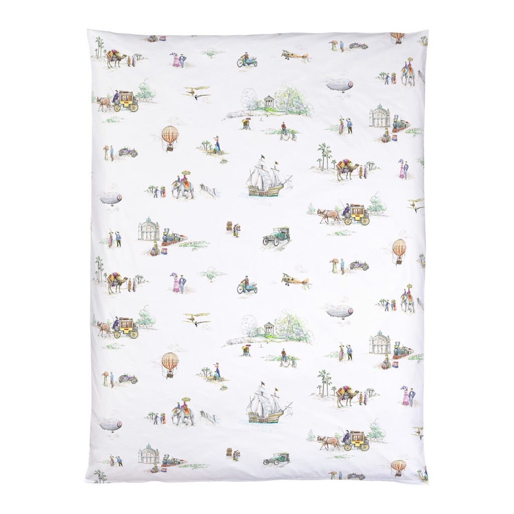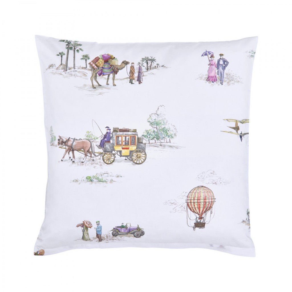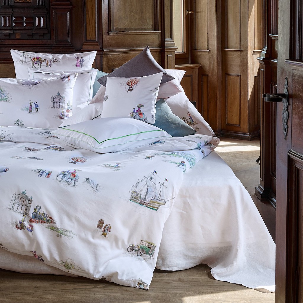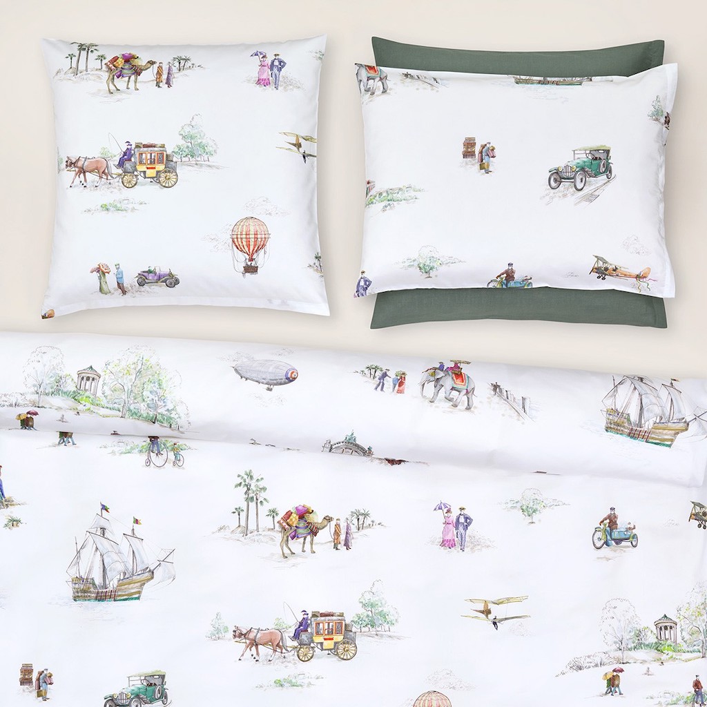 Christian Fischbacher's Voyage has exquisite pencil drawings reminiscent of nostalgic travel adventures adorn this VOYAGE bed linen. Framed by dynamic backdrops, every design reveals the story of a voyage. The destination is the journey itself. Be it by plane, boat or camel; be it long-distance or just over the next hill – people have always been fascinated by exploring new places, an activity which both evokes memories and ignites their imagination. 100% cotton.