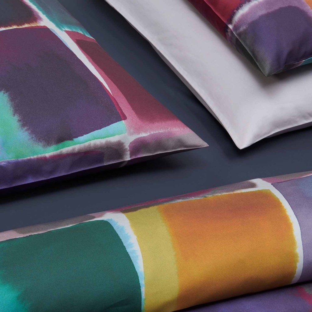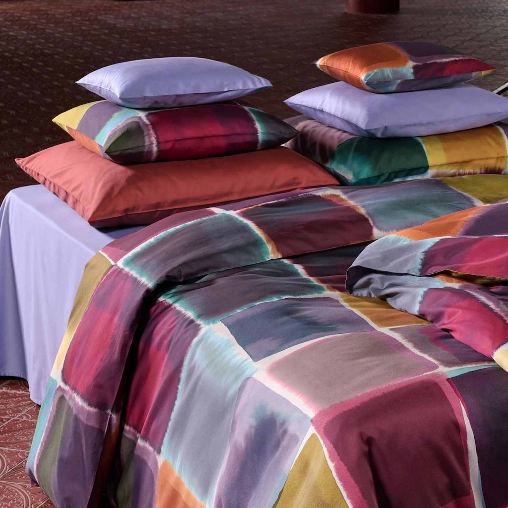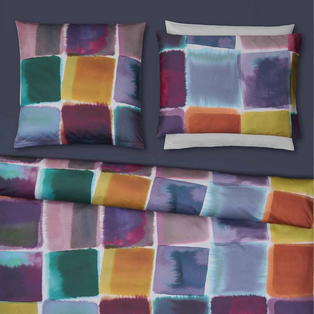 Christian Fischbacher's Yuma's fine sateen gives this bed linen a brilliant shine, making it simply perfect. Those who like things to be colorful yet calm will love this bed linen. Large, systematically arranged watercolour squares come together in a holistic piece of art that invites you to snuggle into it. 100% cotton sateen.