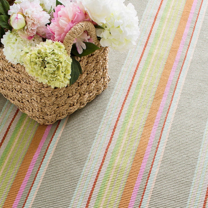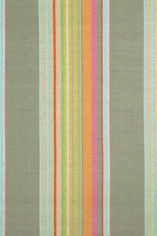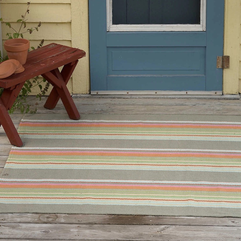 Bright stripes of red, orange, pink, citrus, and sky pop against sage green on this eco-friendly indoor/outdoor rug made of recycled polyester. Dash & Albert indoor/outdoor rugs are ultra-durable construction, water-resistant, and UV-treated for fade resistance; low profile, lightweight, and reversible. A rug for all seasons! Terrific for high-traffic areas; kids' rooms; staircases; muddy messes such as sunrooms, decks, and porches; and any floor that gets wet - like the bathroom, the kitchen, or the basement. Made in India. Not sure which pattern or color? We suggest you order the smallest rugs as they are the least costly to return.