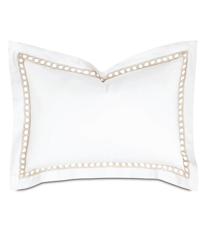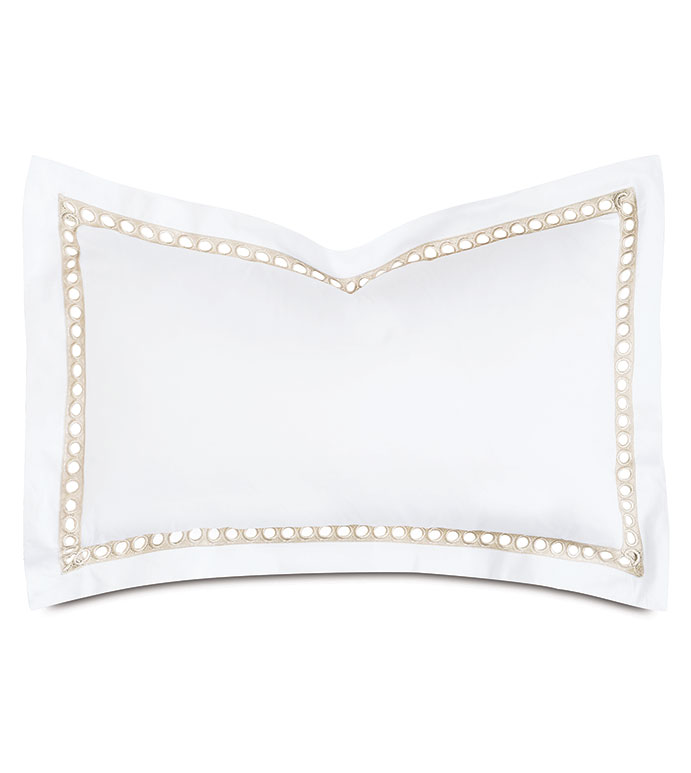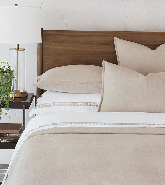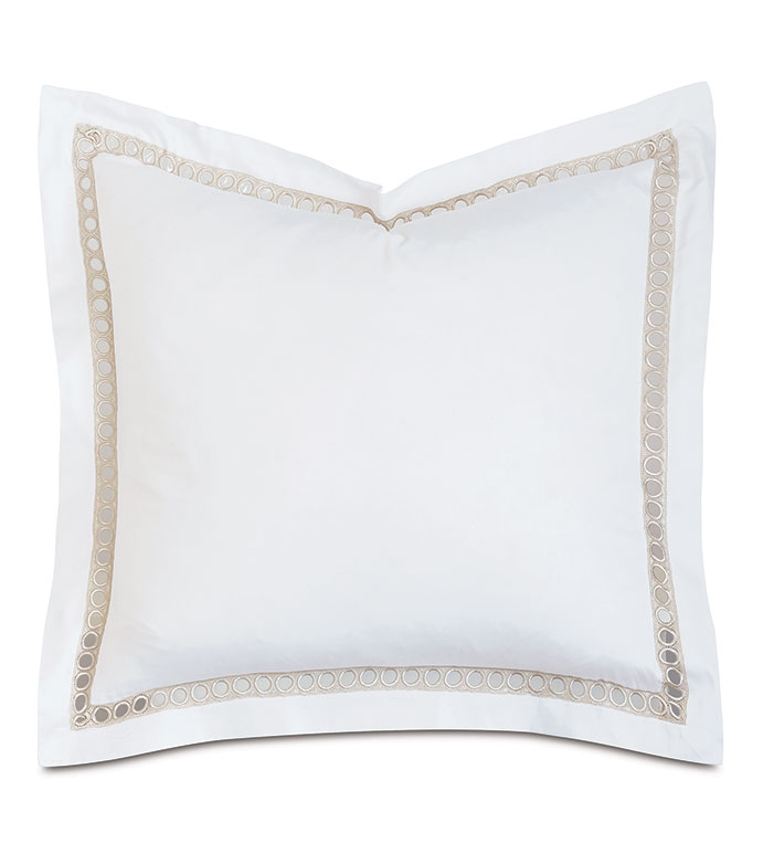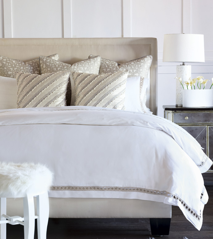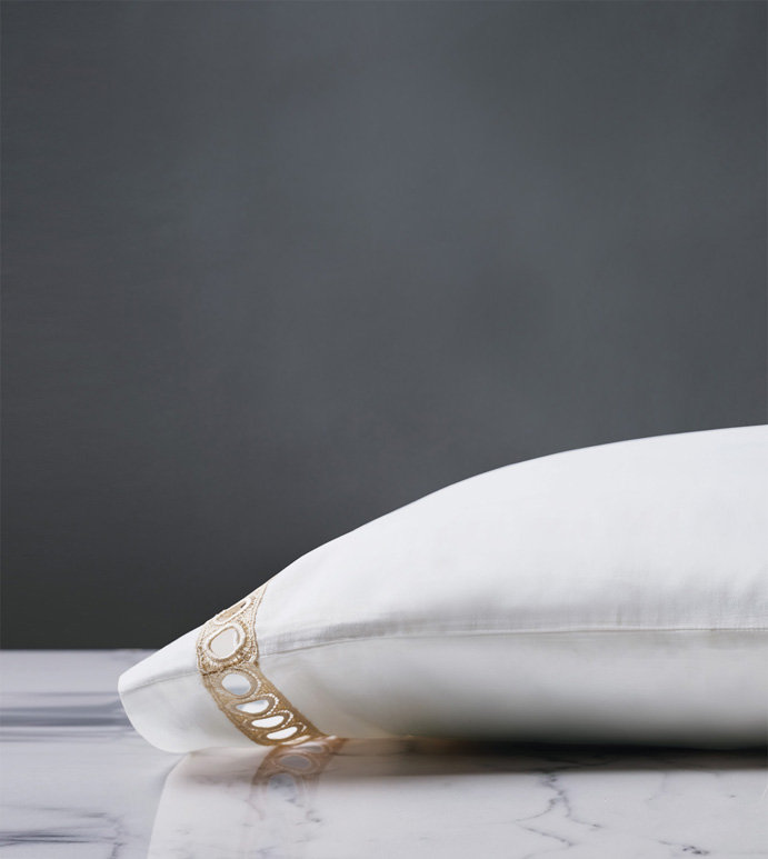 De' medici Celine collection has intricate lace in subtle shades of champagne and silver elevates the crisp white Egyptian cotton for a modern, glamorous feel. This heirloom quality collection pairs beautifully with a variety of styles adding a touch of romance and elegance to any setting. Celine's delicate Guipure lace and luxurious sateen define luxury fine linens. 300 thread count sateen with Guipure lace insert. 17” gusset on fitted sheet. Woven in Italy of the finest Egyptian cotton.