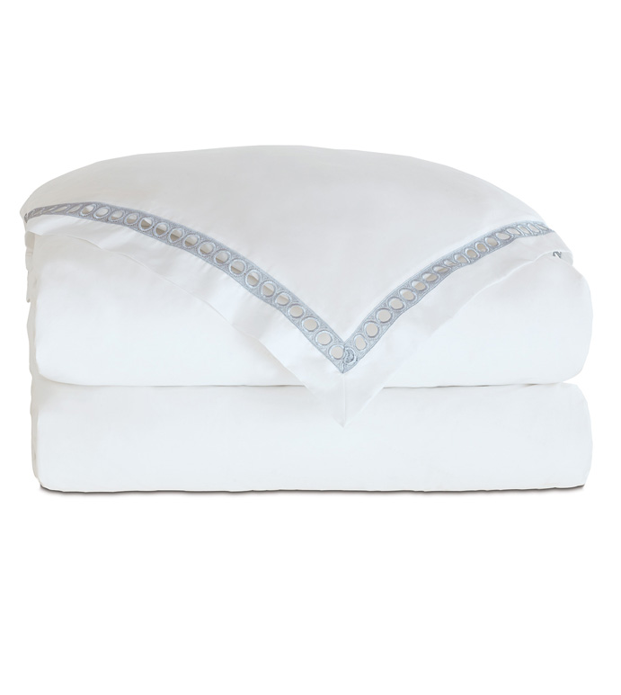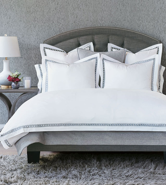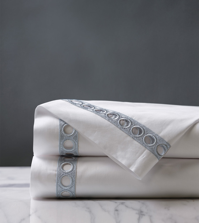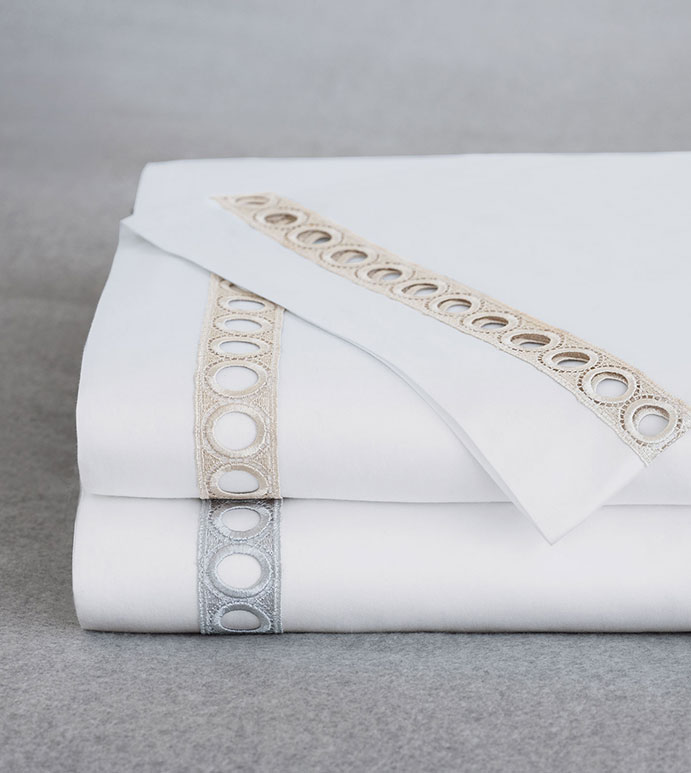 De' medici Celine collection has intricate lace in subtle shades of champagne and silver elevates the crisp white Egyptian cotton for a modern, glamorous feel. This heirloom quality collection pairs beautifully with a variety of styles adding a touch of romance and elegance to any setting. Celine's delicate Guipure lace and luxurious sateen define luxury fine linens. 300 thread count sateen with Guipure lace insert. 17” gusset on fitted sheet. Woven in Italy of the finest Egyptian cotton.