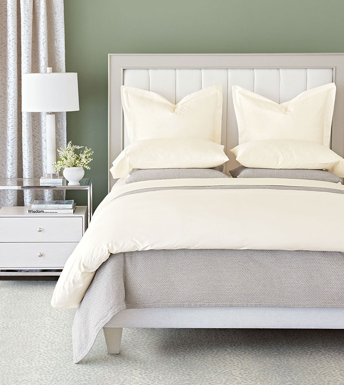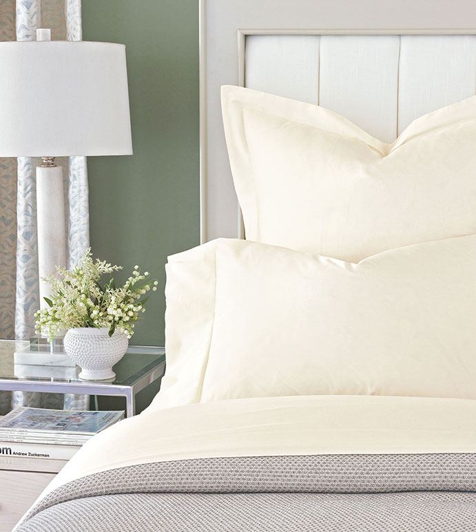 removed the flange from the duvet cover to create cleaner lines. 2" self flange with top stitch on the shams and Flap closure for easy care. Duvet cover has a knife edge finish, ties inside, and a hidden button closure. 300 thread count sateen. Woven in Italy of the finest Egyptian cotton.