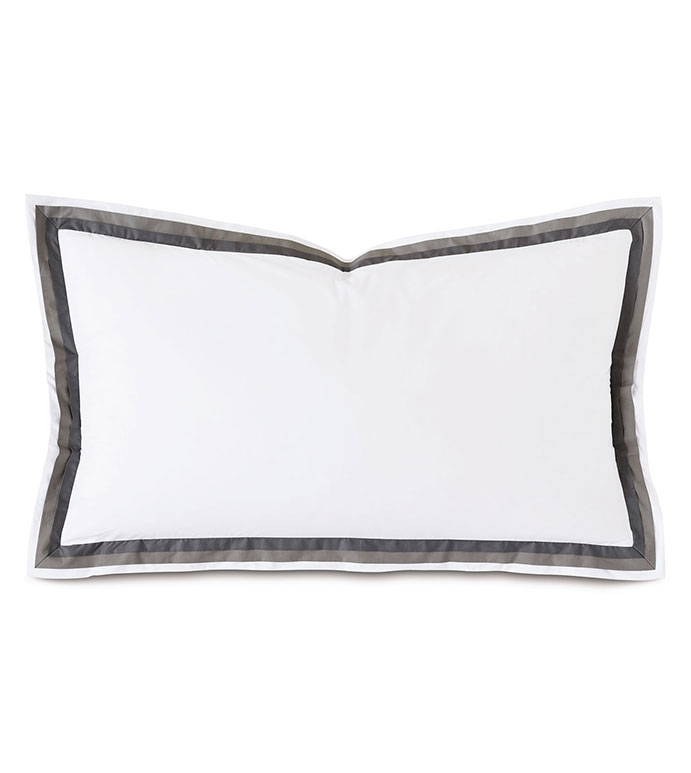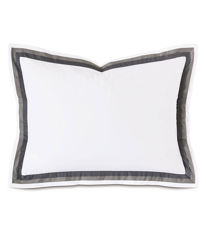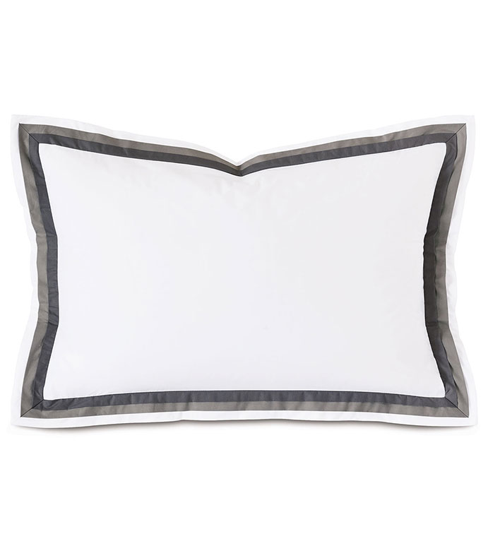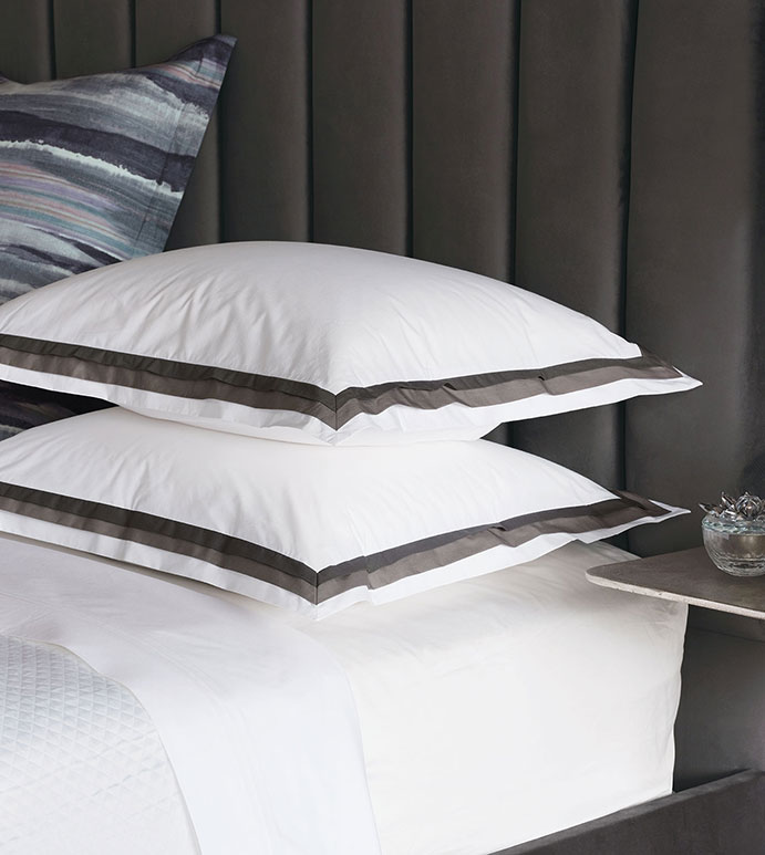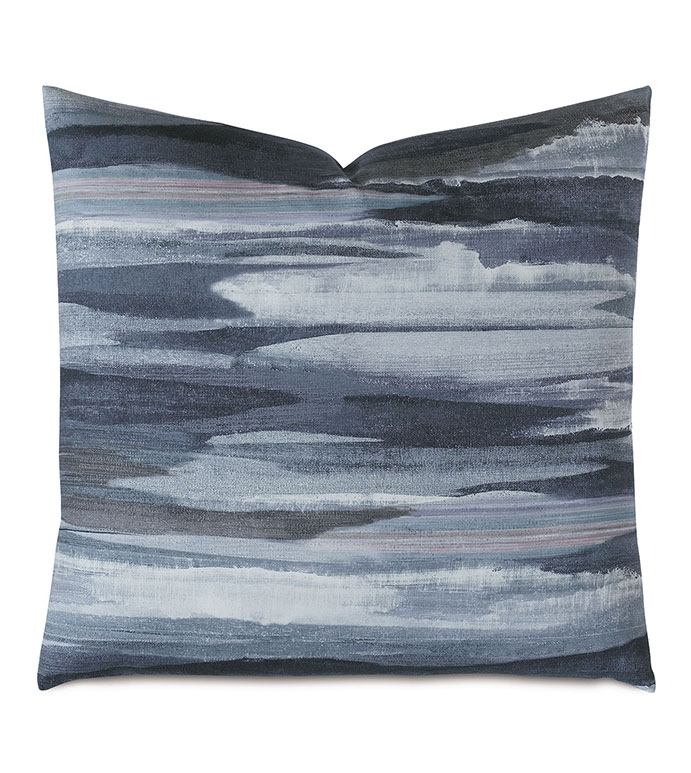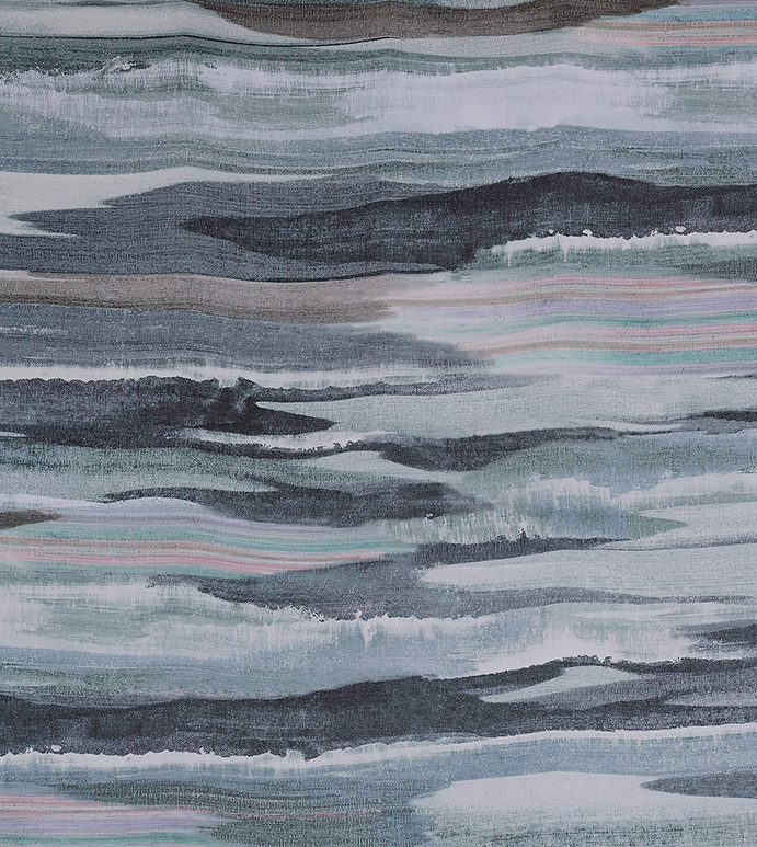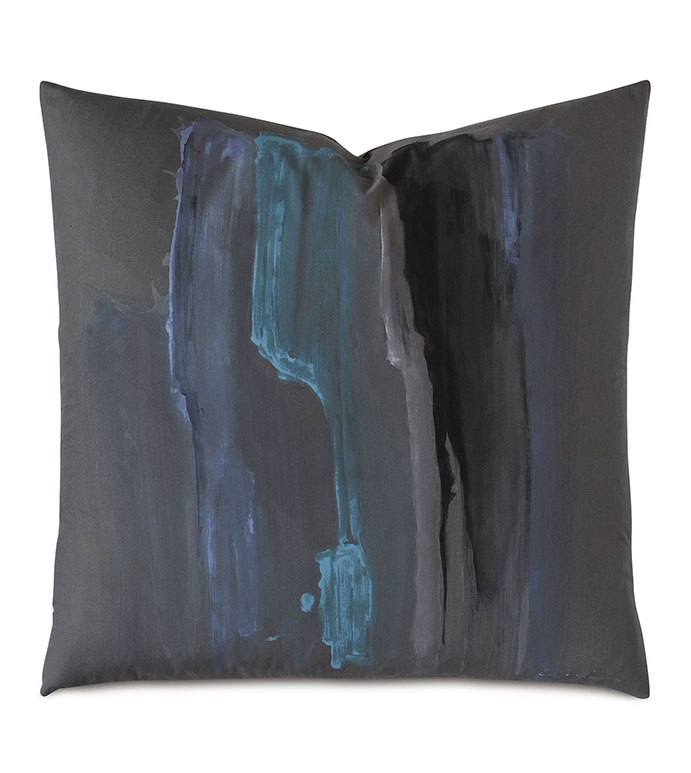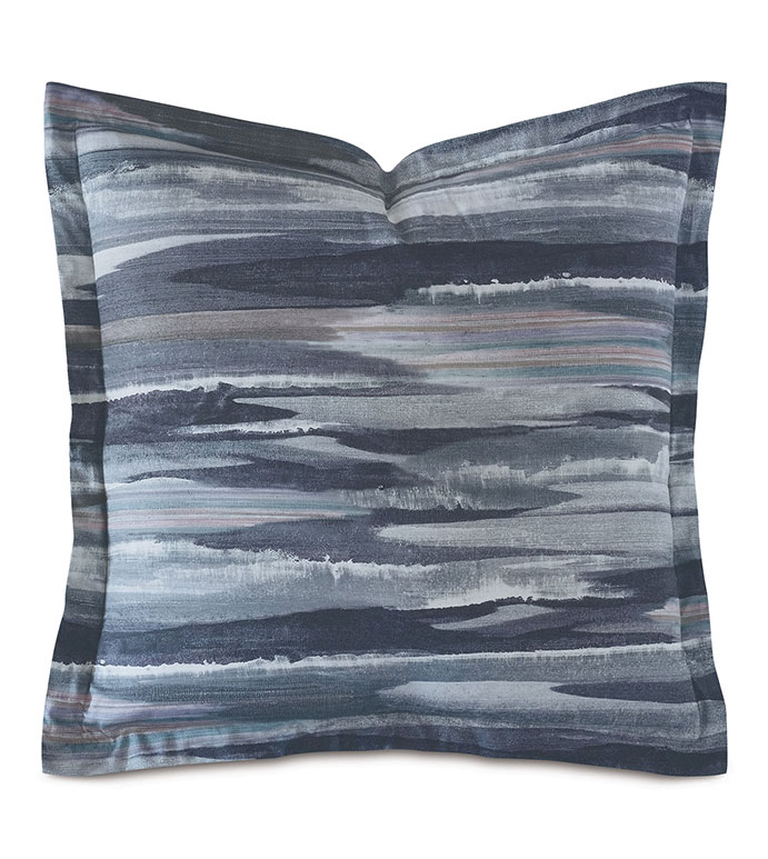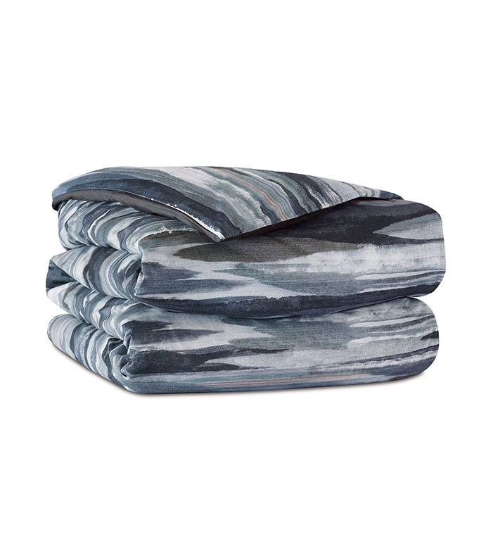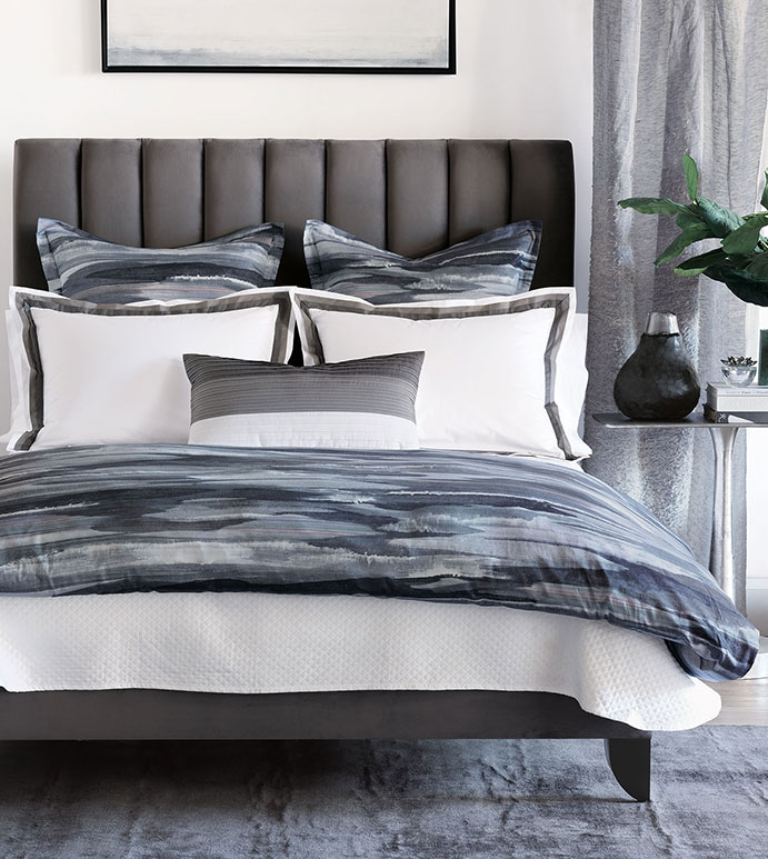 Lyra, from de Medici, is printed on Sateen and Percale.  Its Ombre dark stormy blue-grays mimic rough seas yet it is soothing. Beautifully hand painted this collection is stunning.  The expertly crafted pleats make this a true luxurious bedding collection.