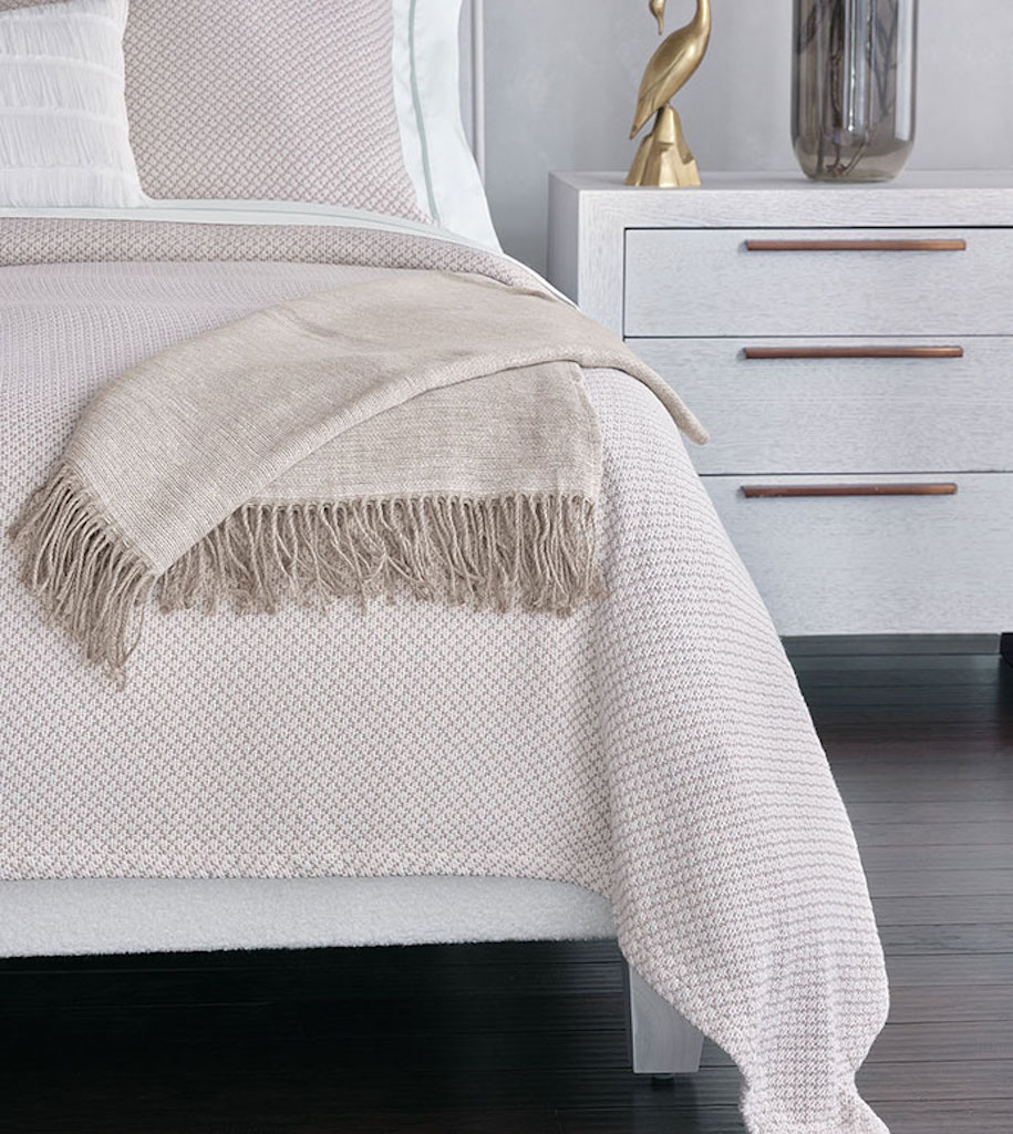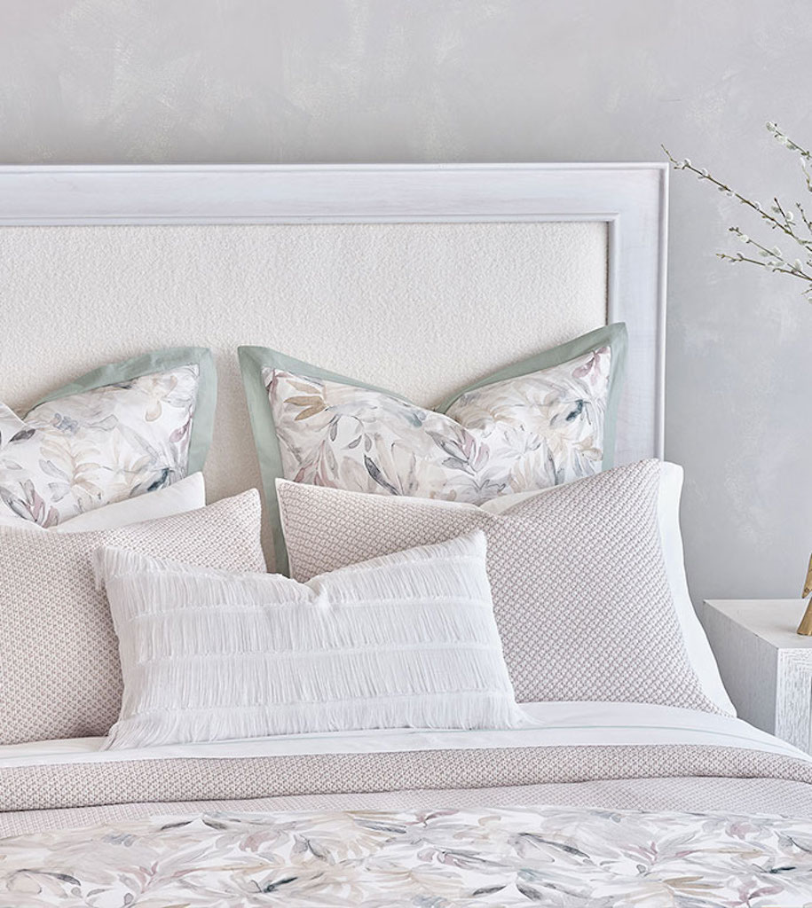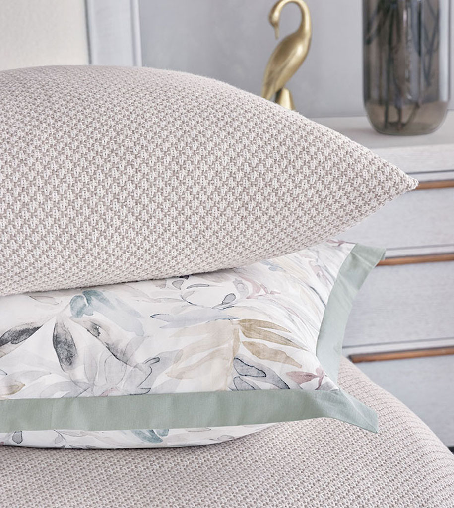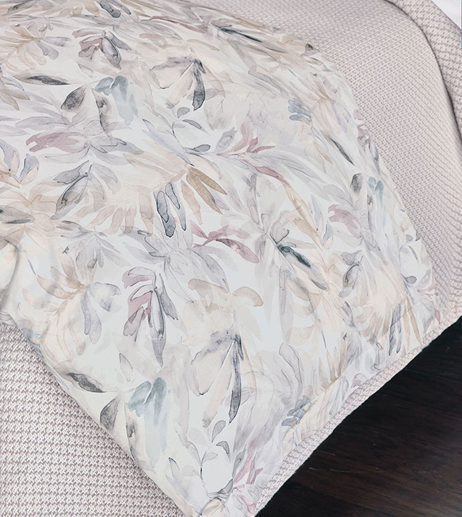 De' medici Meadow collection is inspired by airy New England shores, this collection of 300 thread count printed sateen a botanical print in muted spa, sand, and mauve. Discover the refined coastal aesthetic of Meadow and add layers of texture with Meadow's sandy basketweave coverlet, cut-fringe decorative pillow, and lightweight 100% linen throw. Duvet cover in 100% cotton with a watercolor like botanical print fabric face. Reverses to Nuvola Classic White in 300 thread count sateen. 2" self flange edge finish. Ties in all four corners for easy comforter attachment. Button closure for easy care. Basketweave coverlet is a textured basketweave fabric with 1" hem with square mitered corners. Basketweave shams are in a textured basketweave fabric. Self-backed in Teja Sandstone. Knife edge finish. Horizontal flap closure. The decorative pillow in a brush fringe fabric. Self-backed in Belem Snow. Knife edge. Pillow insert included. Invisible zipper closure for easy care. Linen throw is 100% lightweight linen throw. Self-backed in Saskia Sand. Brush fringe edge finish.