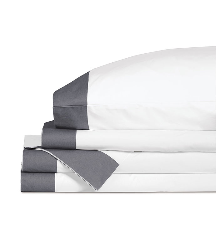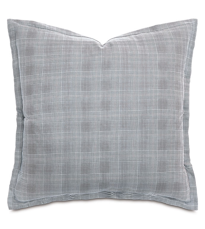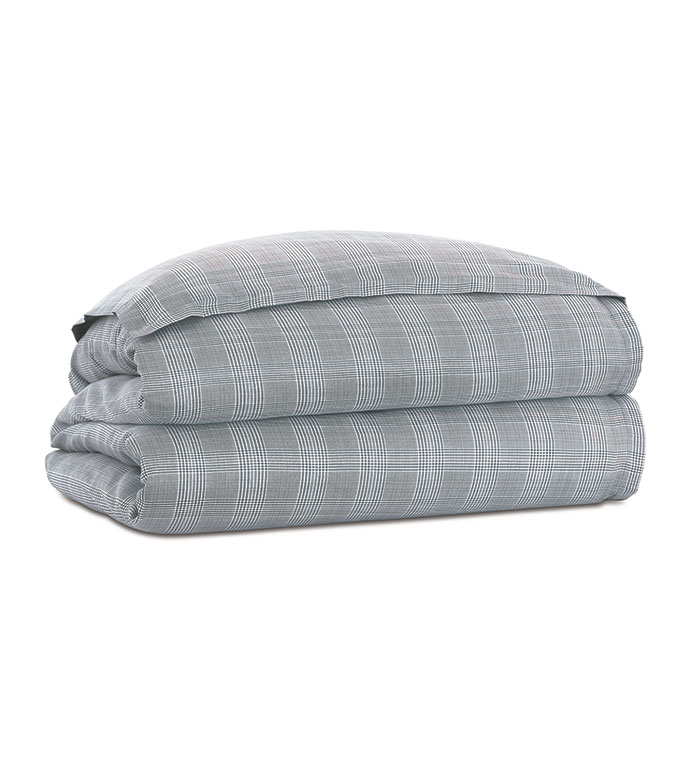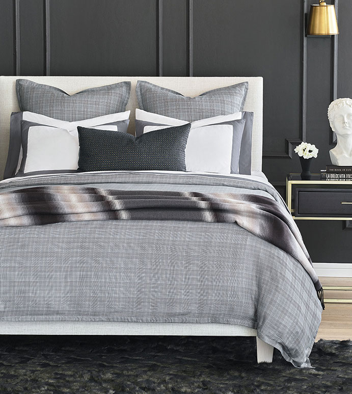 De' Medici's Octavius features houndstooth plaid in 100% tencel and percale sheeting with a contrasting edge in Chiaro Classic Slate. Complete this tailored look with Octavius' wool-mix decorative pillow, featuring a burned-out square pattern. Duvet cover is in Vilem Grey, reverses to Chiaro Classic Slate, has self-flange on edge, ties inside all four corners for easy comforter attachment, and has an invisible zipper closure for easy care. Decorative pillow in Cuadrado Charcoal is lined with Walden Ochre, it is self-backed with matching design on both sides, has a knife edge finish and a zipper closure for easy care. Bedding is 200 thread count percale crafted from 100% Egyptian cotton. Woven in Italy.