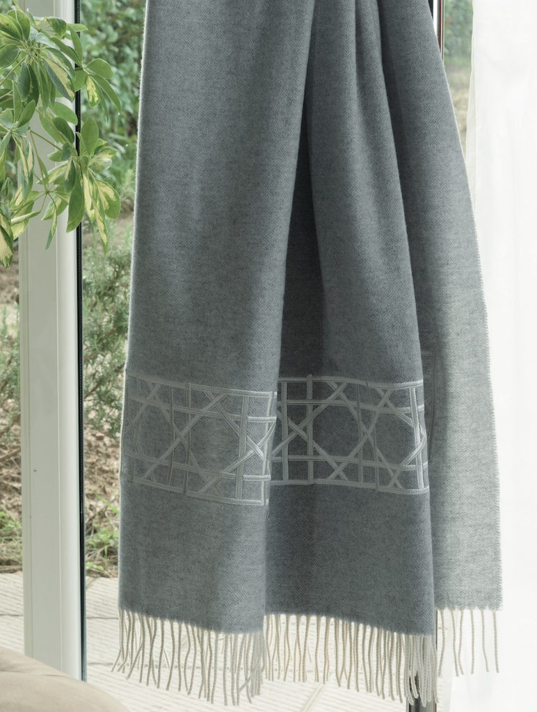 Timothy Corrigan for Dea's Cane Embroidery Throw 's design intensifies the beauty of any combination. Its design has intricate latticework of caned furniture. Cane is a contemporary rendering of Tuscan craftsmanship, where embroidery is an ancient art. Cashmere.