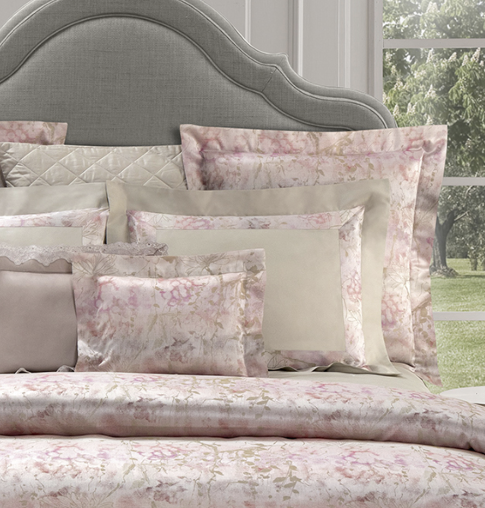 Dea Affresco's Border design represents a painting technique that Italian Artisans use to add color to fresh plaster (a fresco). The over all effect is soft and stunning. Raso is a 350 thread count 100% cotton sateen with Affresco jacquard insert applied on top. Insert Jacquard Sateen Border. Shams: Insert Jacquard Sateen Border. Duvet Cover: "U-Shaped” Insert Jacquard Sateen. Top Sheet: Double return Top with Insert Jacquard Sateen Border. Pillowcases: Along cuff Insert Jacquard Sateen Border. Available in 4 colorways. 100% Cotton Yarn-dyed cotton Sateen Jacquard. Made in Italy.