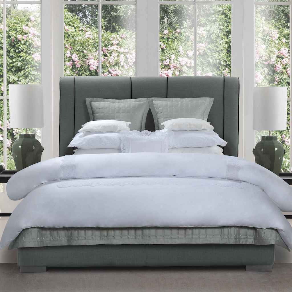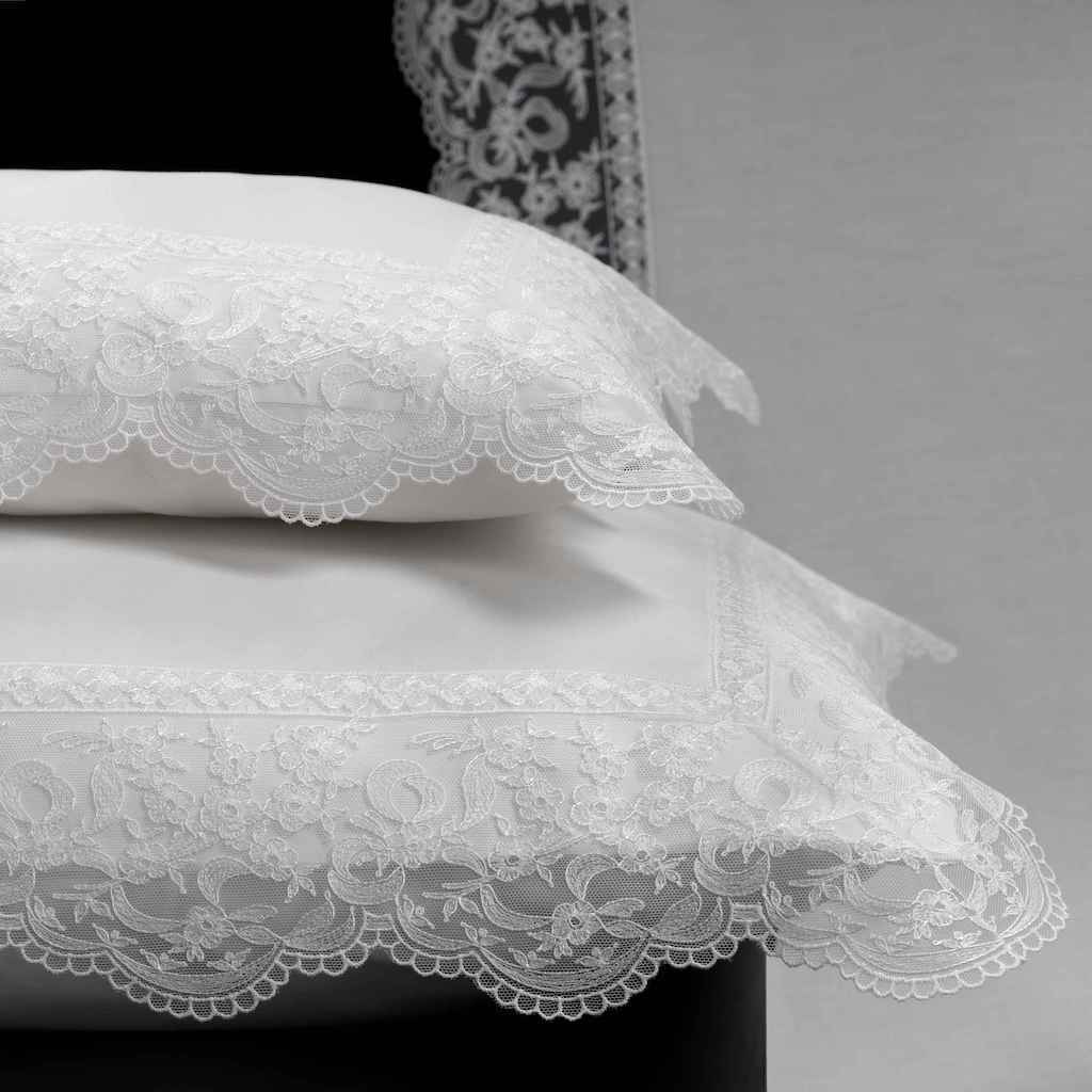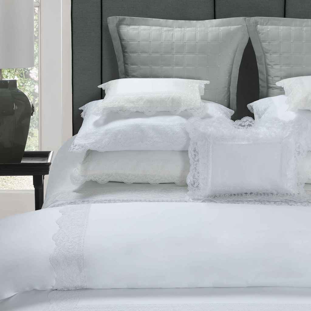Duvet Cover: Knife-edge and hidden-button closure; U-shaped lace on top of the bed.