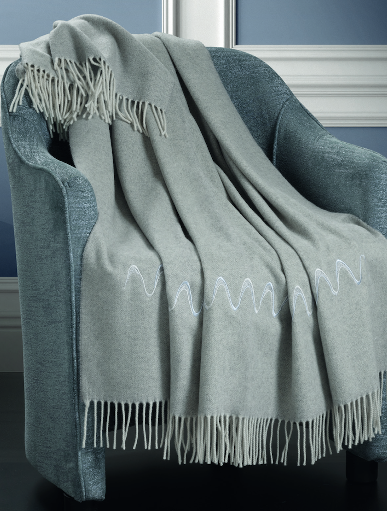 Timothy Corrigan for Dea's Pelago Embroidery Throw's design has geometric lines that form sandy seabeds drawn by the sea waves. Pelago has classical architectural element borrowed from antiquity which imparts a regal elegance. Cashmere.