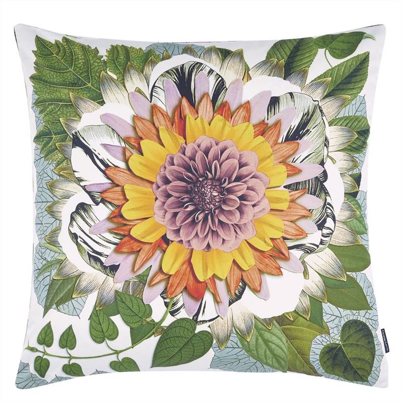 Flowerworks in Camelia is delightful. Abundant and captivating flowers feature in this striking large square decorative pillow with a graphic color palette of warm rose tones with green foliage, this designer floral decorative pillow by Christian Lacroix is digitally printed onto luxurious velvet with cotton sateen on the reverse. Cotton and viscose.