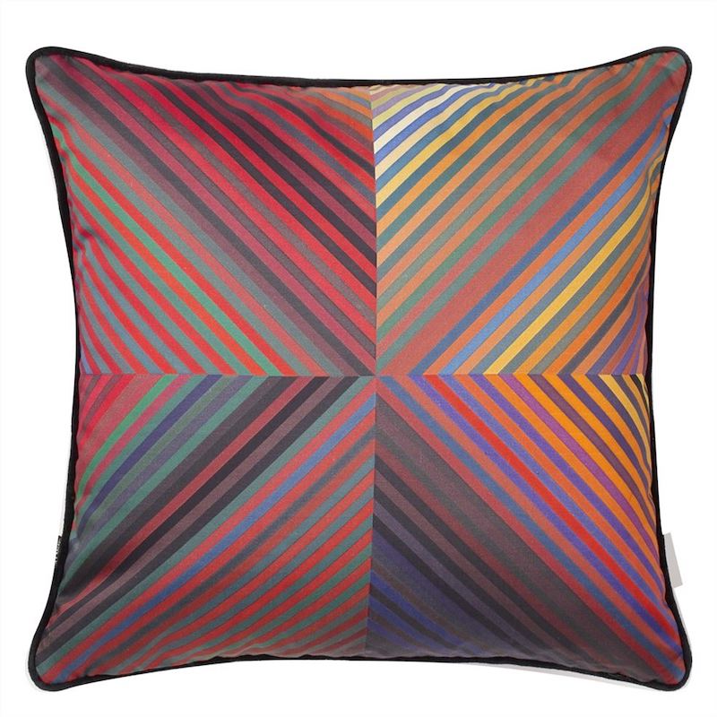 Designed by Christian Lacroix and imported by Designers Guild, the Monogram Me Lacroix! deco pillow features emblem letters that features a playful monogrammed decorative pillow. Digitally printed onto cotton sateen with exquisite embroidered highlights. This designer decorative pillow is completed with black velvet piping on all sides and a multicolored chevon pattern on the reverse.
