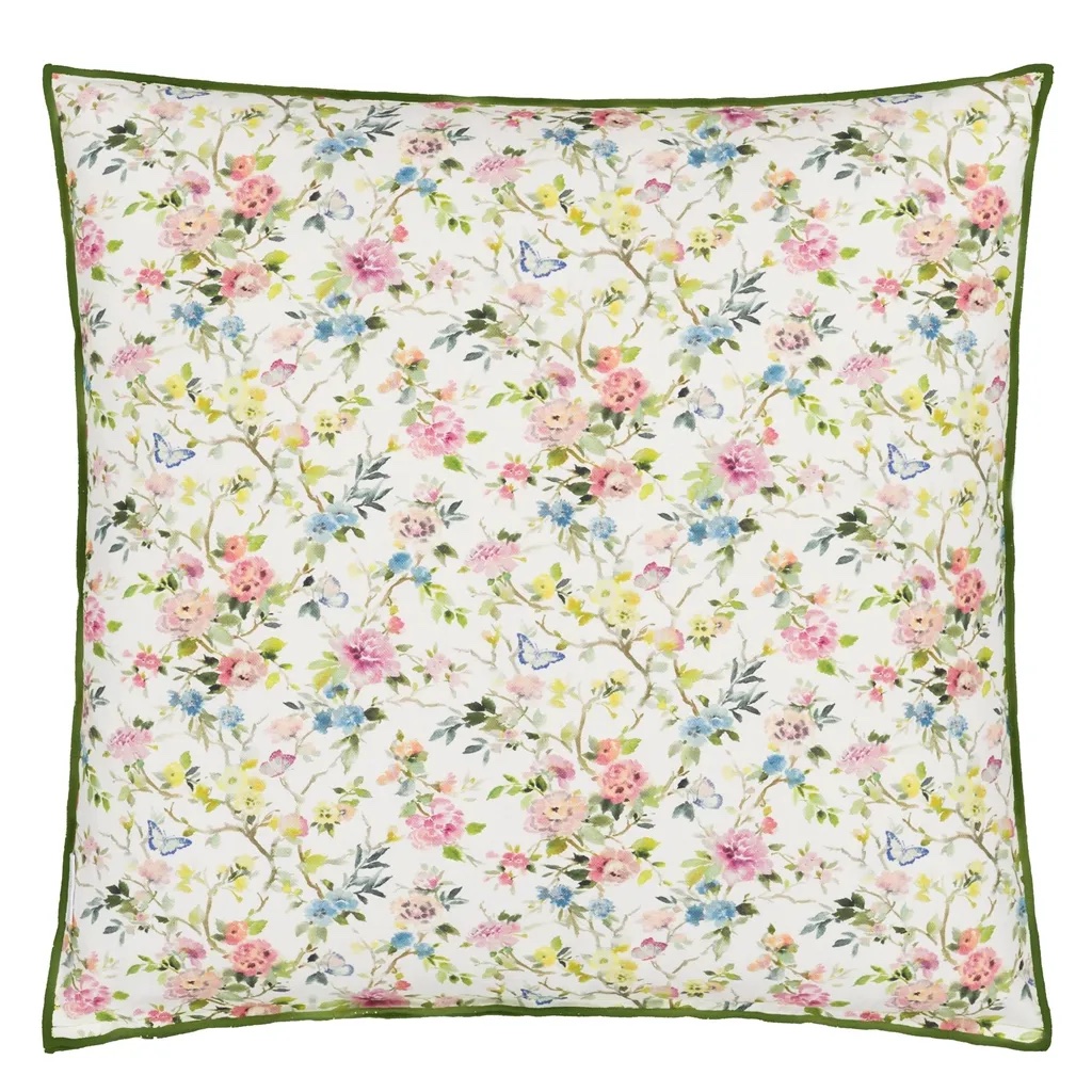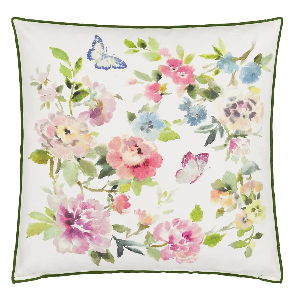 Designers Guild's Fiore D'Acqua Peony Cotton Decorative Pillow is a large square floral decorative pillow that features water colored branches of blossom, blooms and foliage with the occasional butterfly. In soft peony pink tones, this beautiful decorative pillow is digitally printed onto a soft textural cotton and finished with an overlocked edge detail on all four sides.100% cotton. Dry Clean Only.