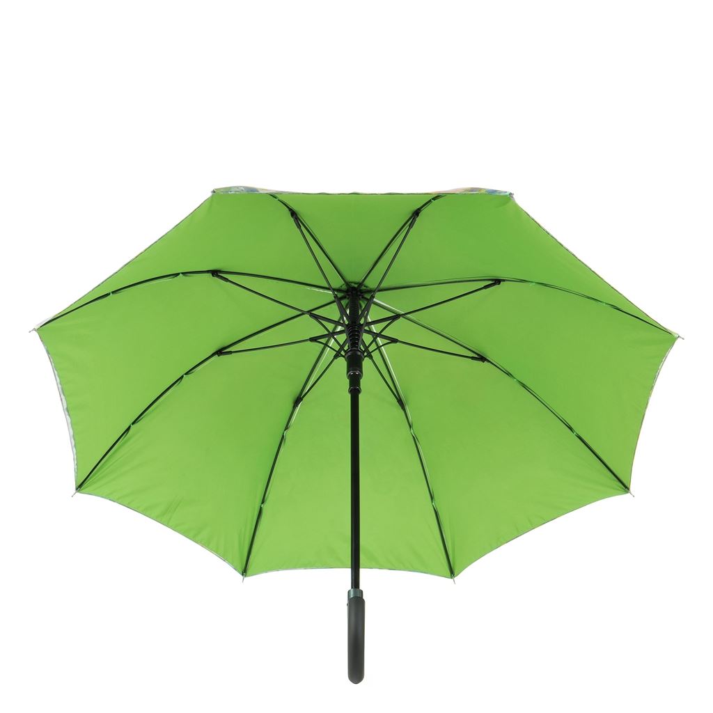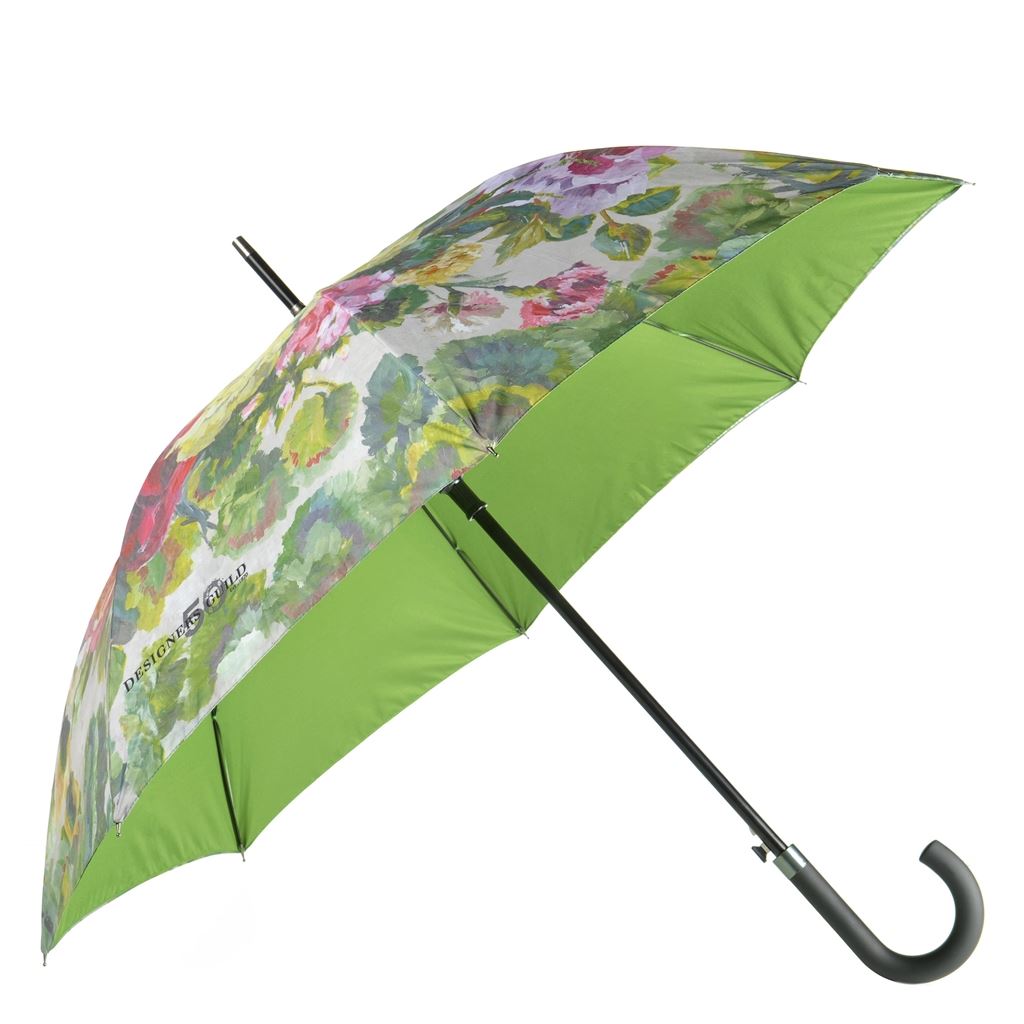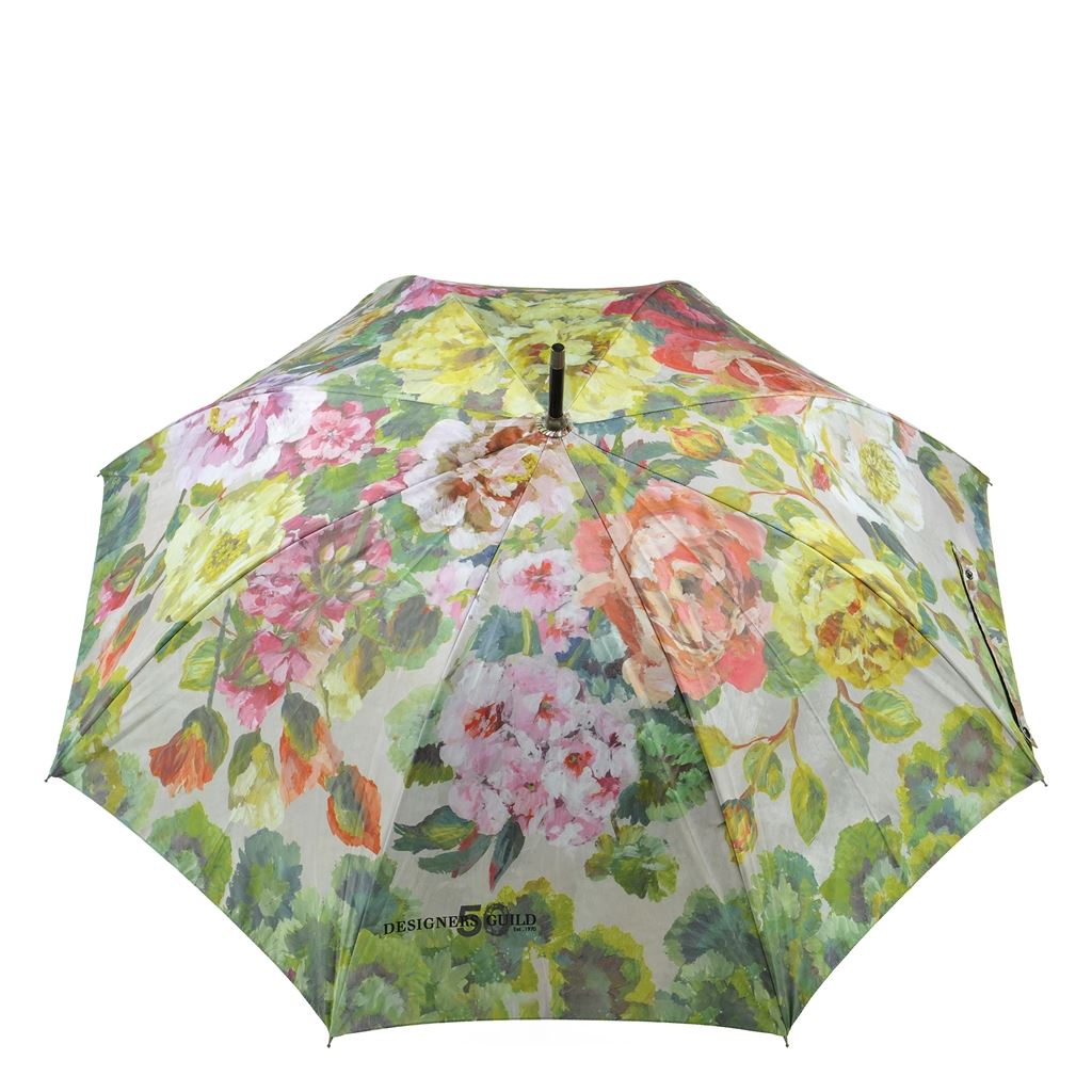 Designer Guild's Grandiflora Rose umbrella consist of a gorgeous cluster of hydrangeas, poppies and peonies that are arranged alongside vivid green geranium leaves. The inside of the umbrella is a cheerful green. It is sure to brighten any rainy day!
